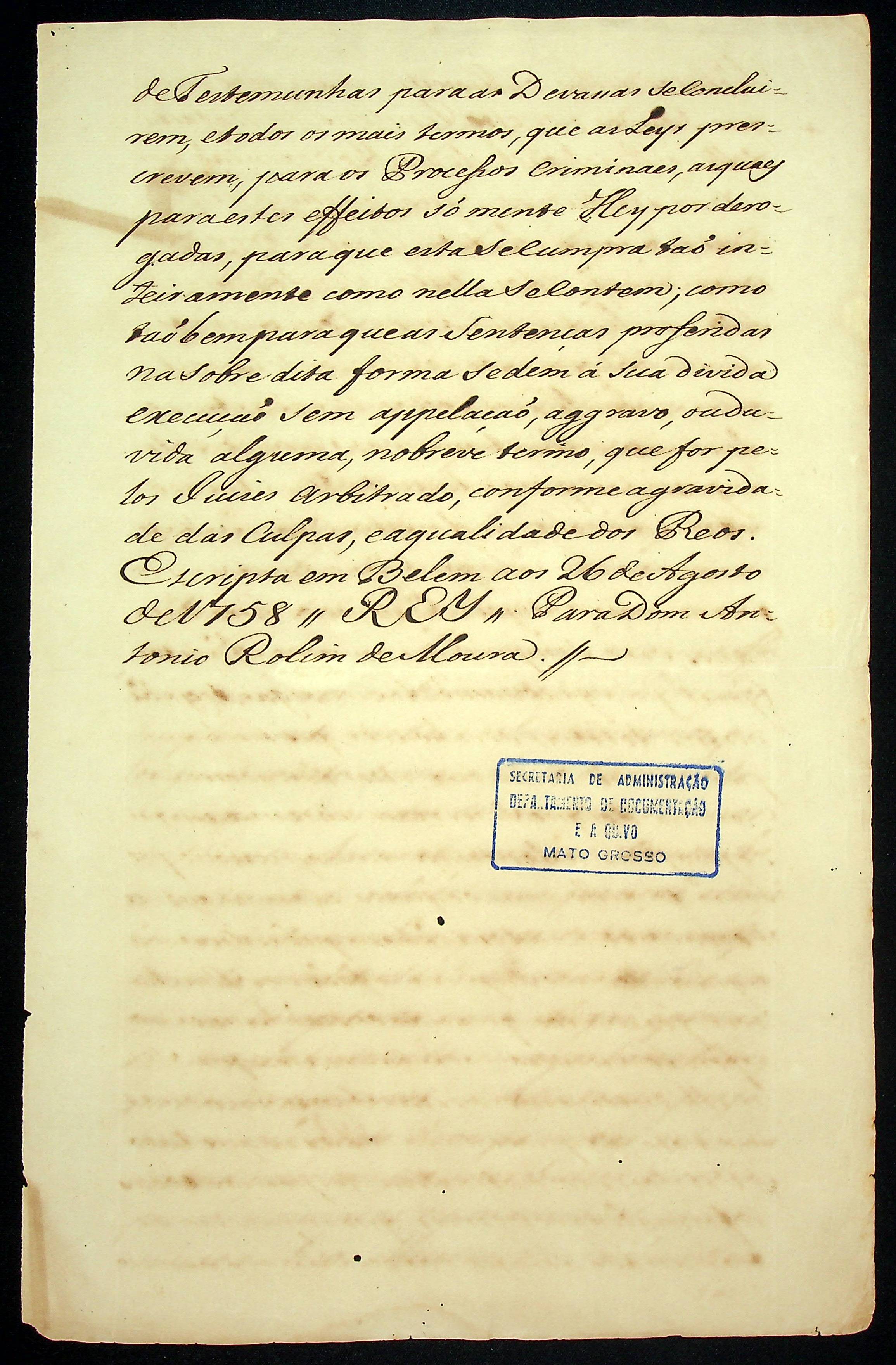 CARTA RÉGIA (Cópia) do Rei Dom José ao Governador e Capitão-General da Capitania de Mato Grosso Antônio Rolim de Moura.