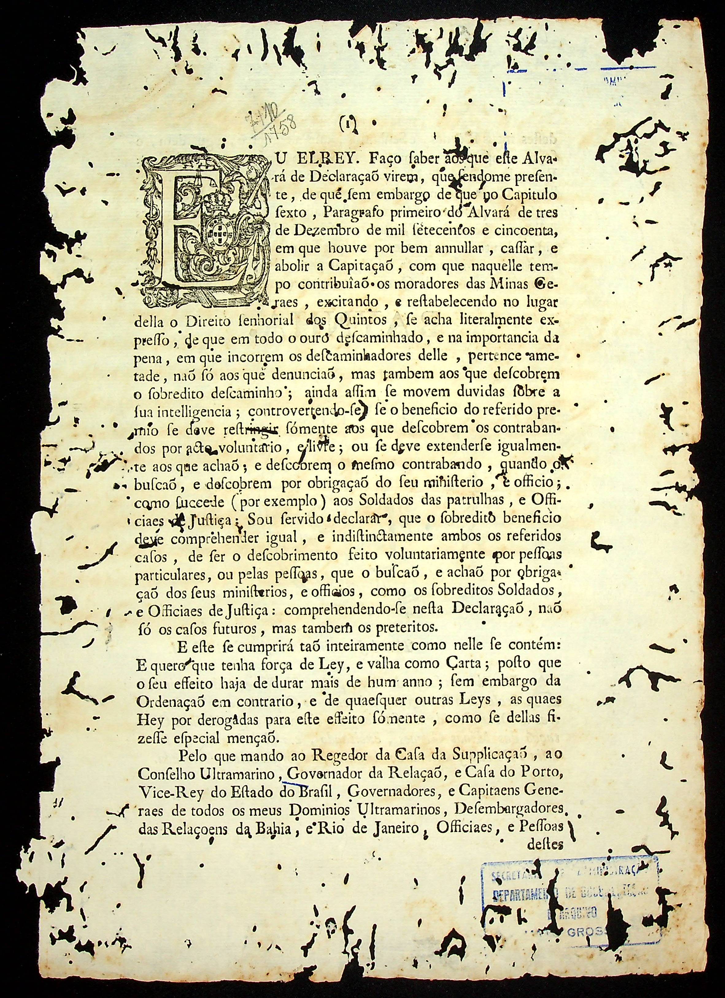 CARTA RÉGIA do Rei Dom José ao Governador e Capitão-General da Capitania de Mato Grosso Antônio Rolim de Moura.