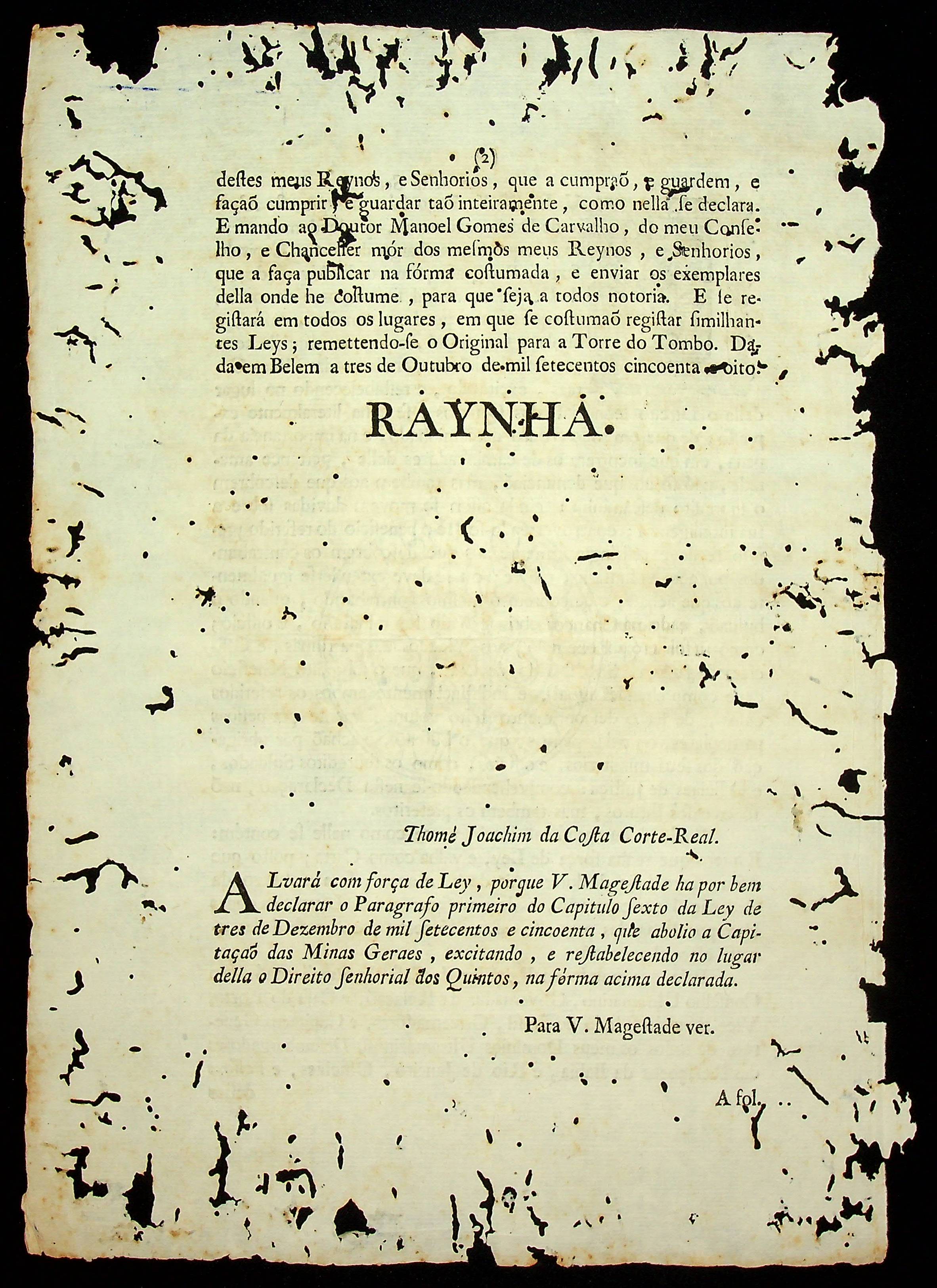 CARTA RÉGIA do Rei Dom José ao Governador e Capitão-General da Capitania de Mato Grosso Antônio Rolim de Moura.