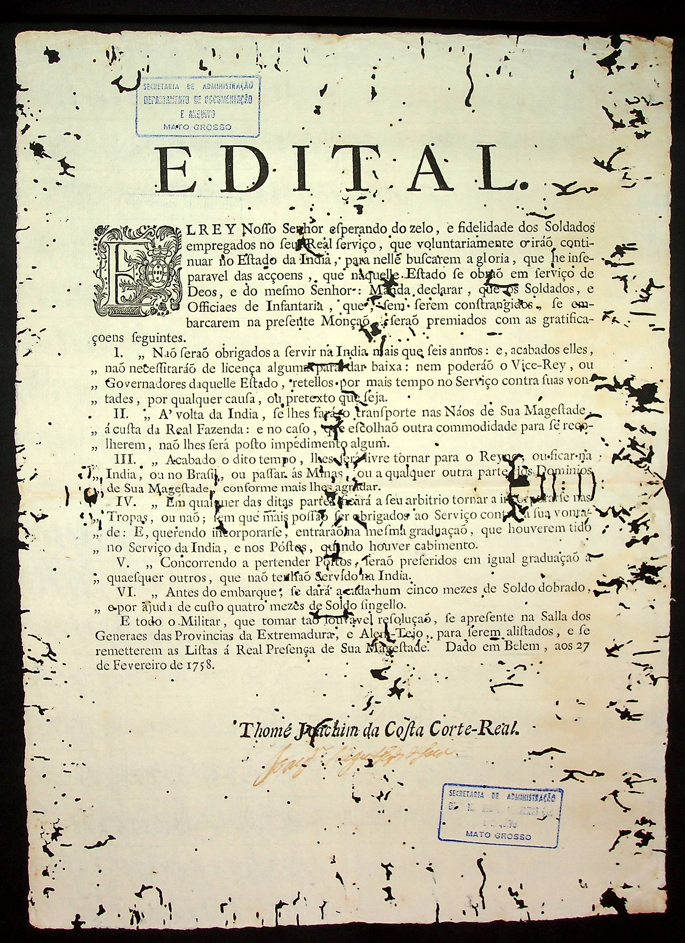 CARTA RÉGIA do Rei Dom José ao Governador e Capitão-General da Capitania de Mato Grosso Antônio Rolim de Moura.