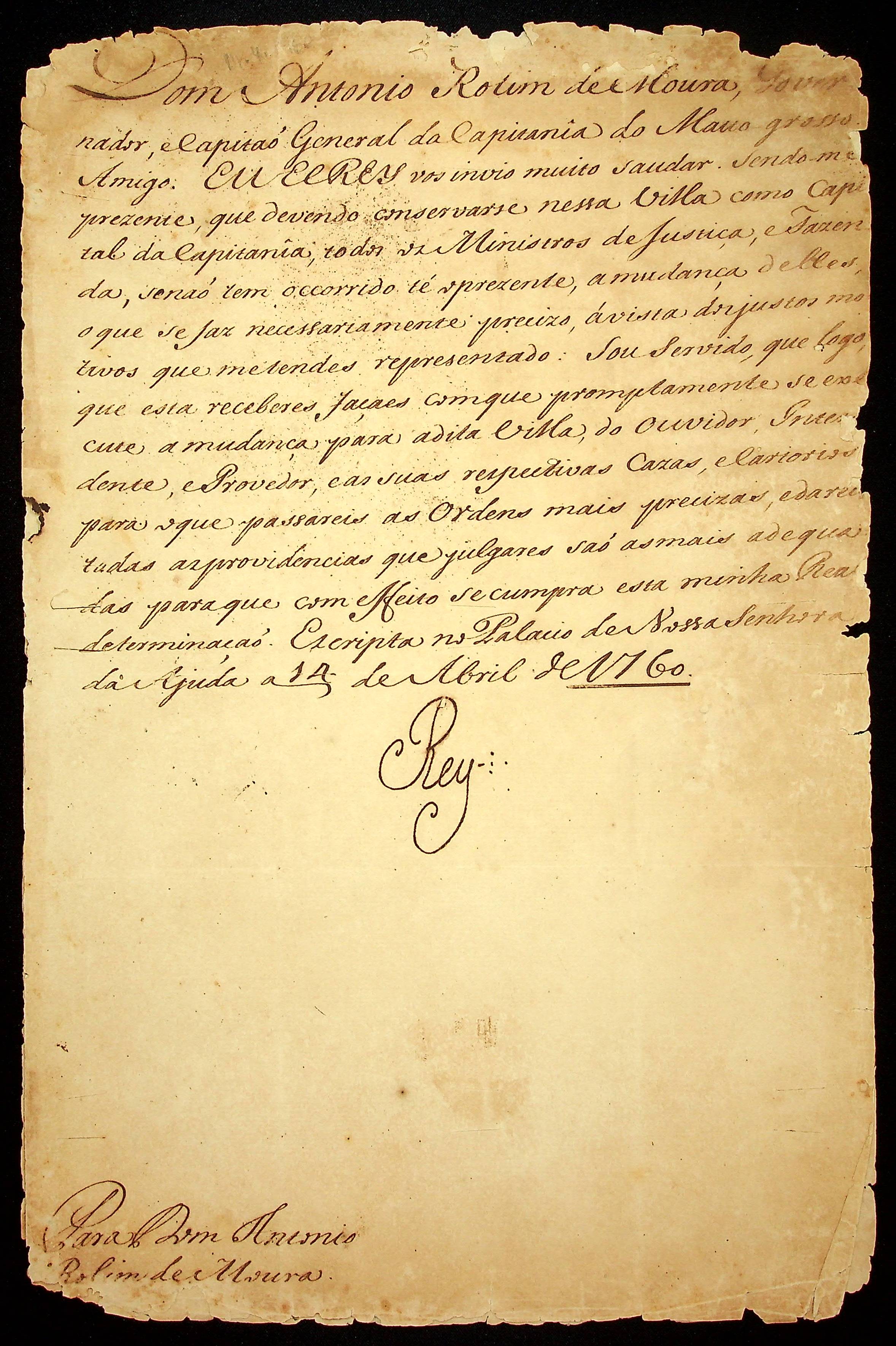 CARTA RÉGIA do Rei [D. José I] para o Governador e Capitão-General da Capitania de Mato Grosso Antônio Rolim de Moura.