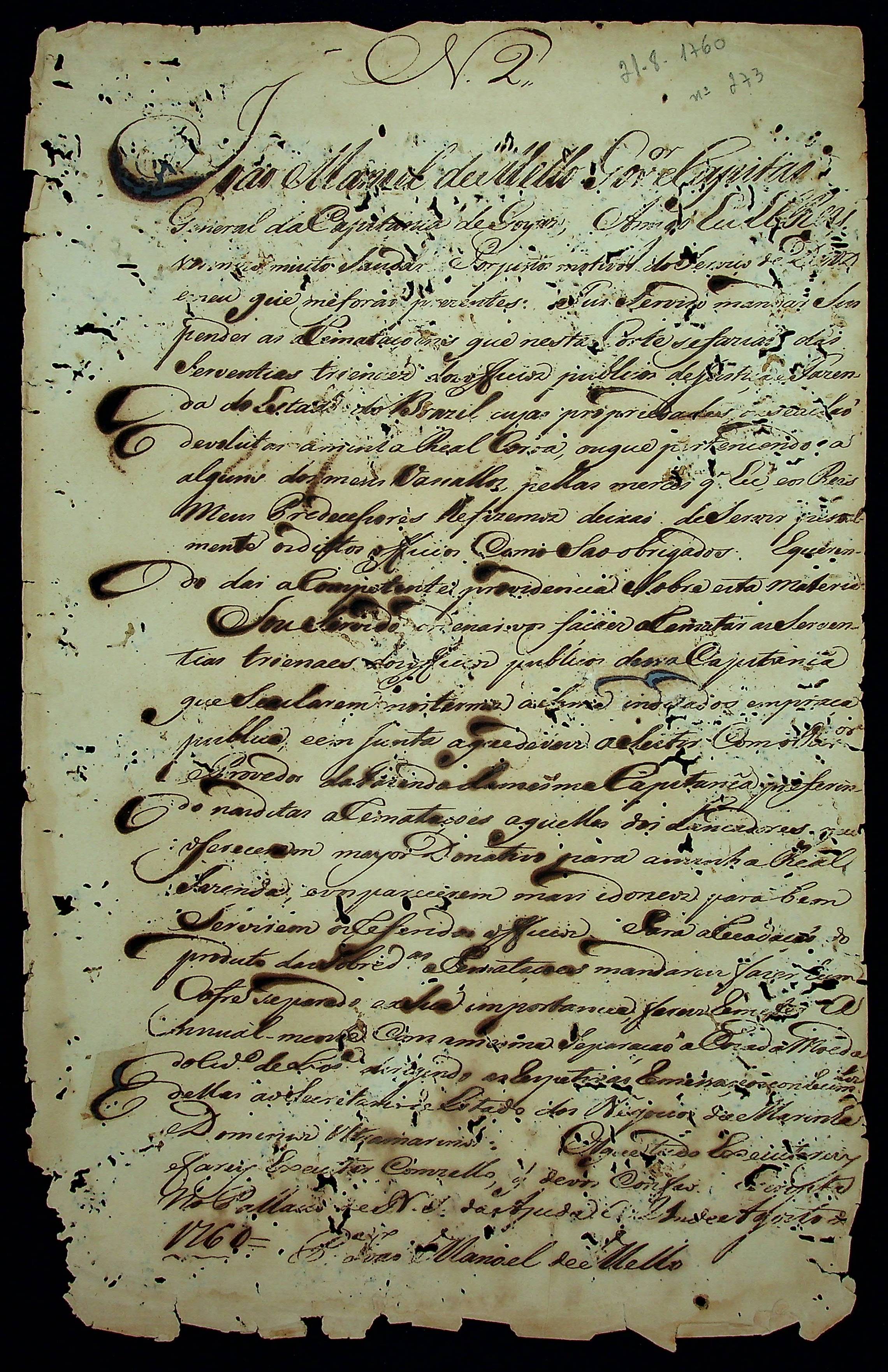 CARTA RÉGIA (cópia) do Rei Dom José I ao Governador e Capitão-General da Capitania de Goiás João Manoel de Mello.