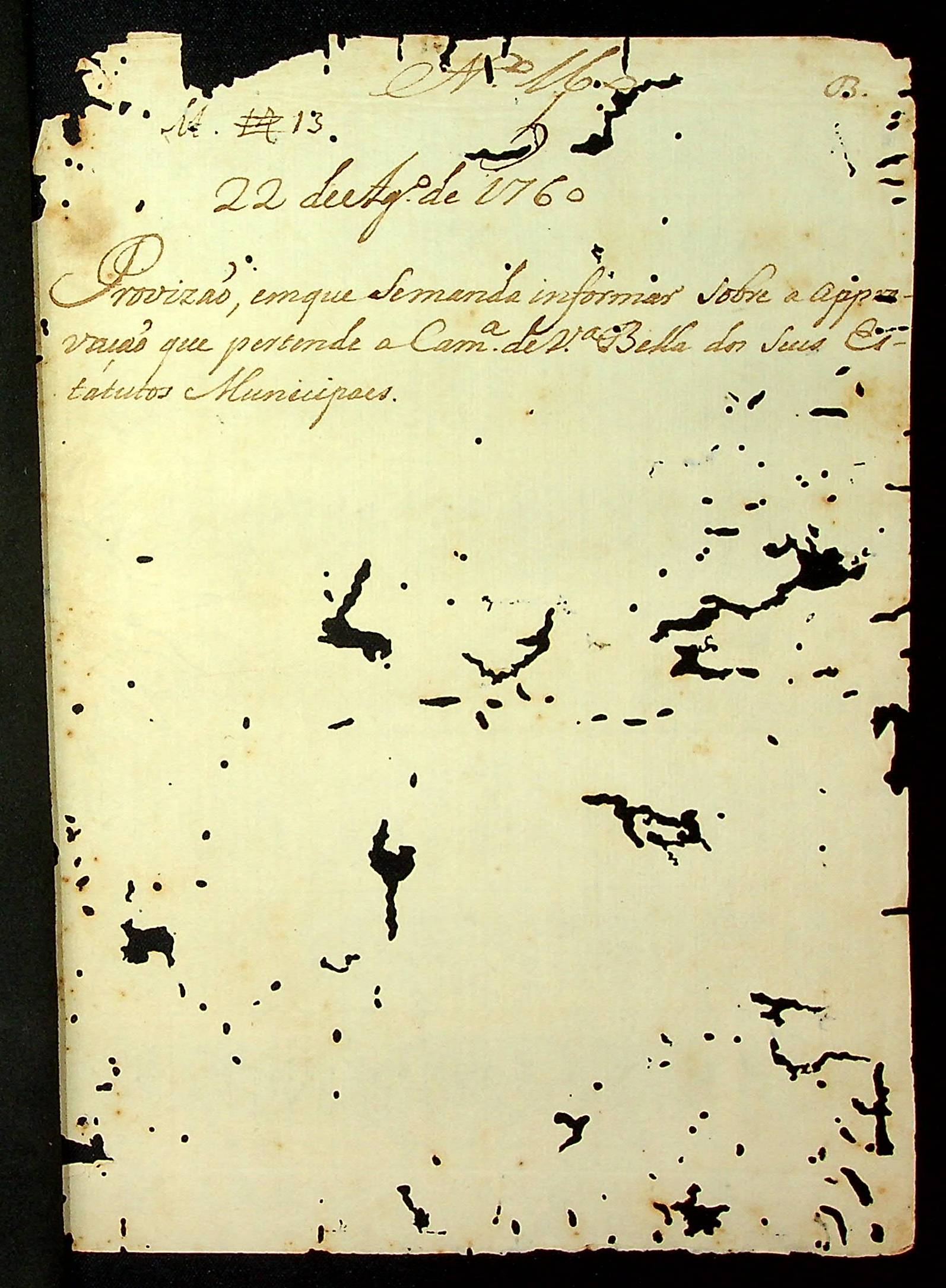 CARTA RÉGIA (cópia) do Rei [Dom José] ao Governador e Capitão-General da Capitania de Mato Grosso Antônio Rolim de Moura.