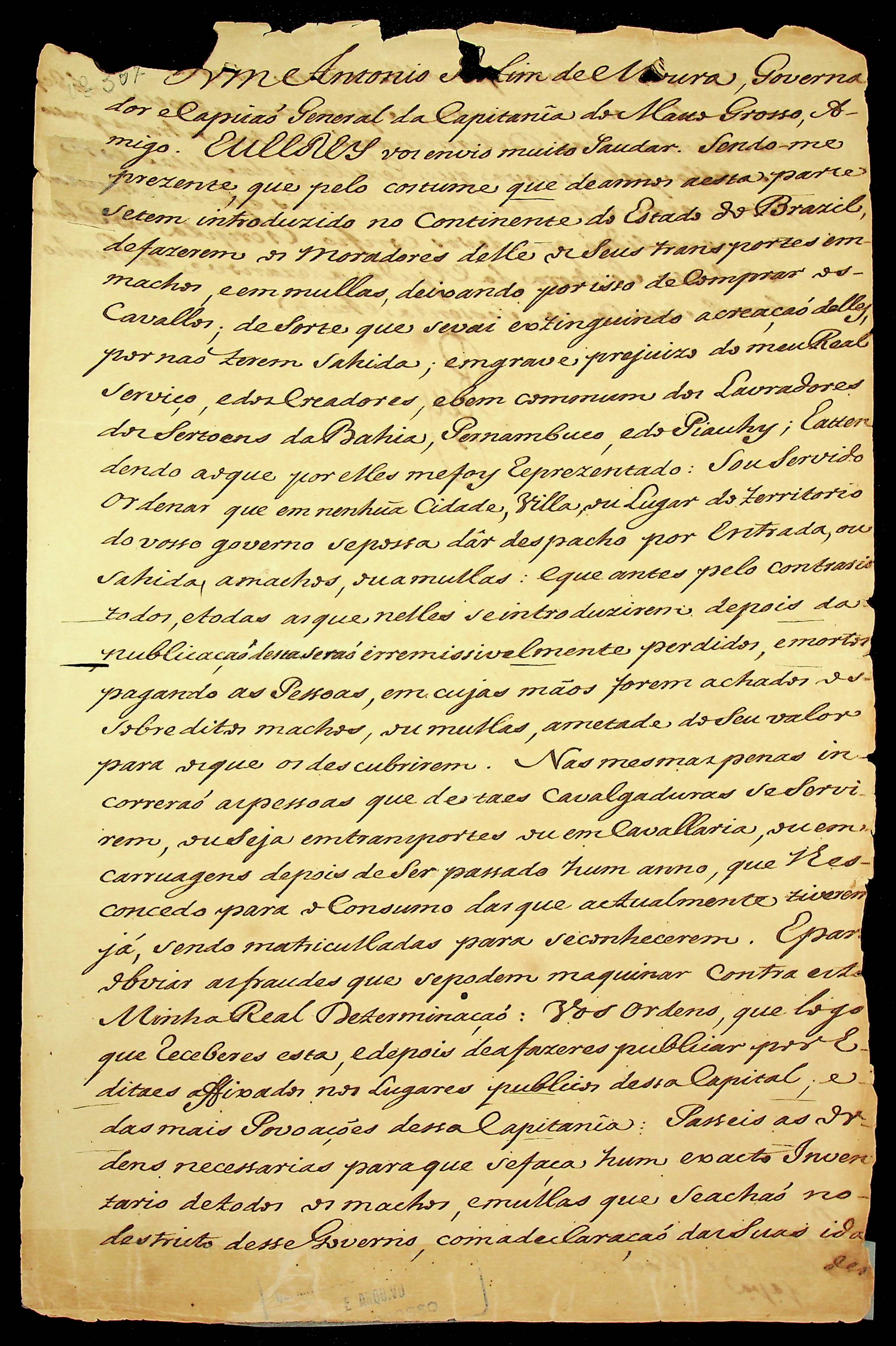 CARTA RÉGIA do Rei [D. José I] ao Governador e Capitão-General da Capitania de Mato Grosso Antônio Rolim de Moura.