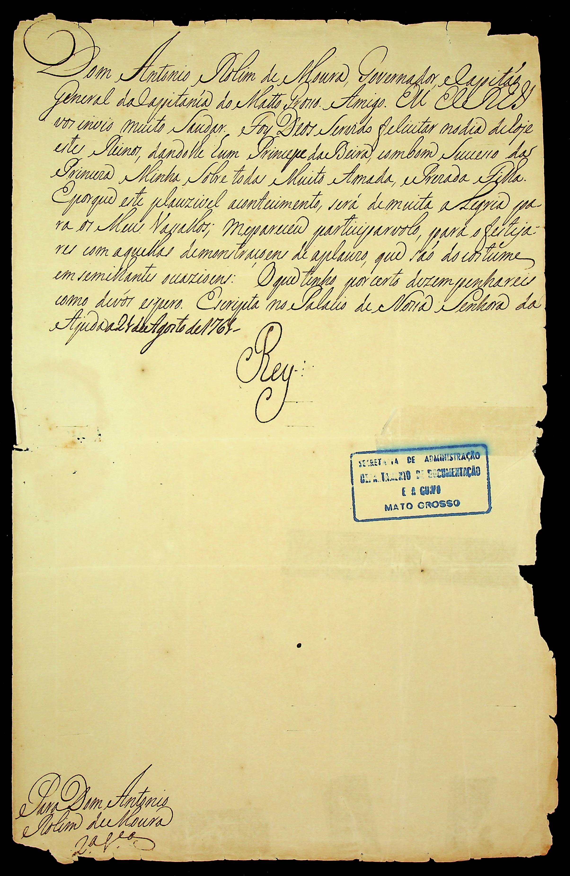 CARTA RÉGIA (Cópia) do Rei [Dom José I] ao Governador e Capitão-General da Capitania de Mato Grosso Antônio Rolim de Moura.