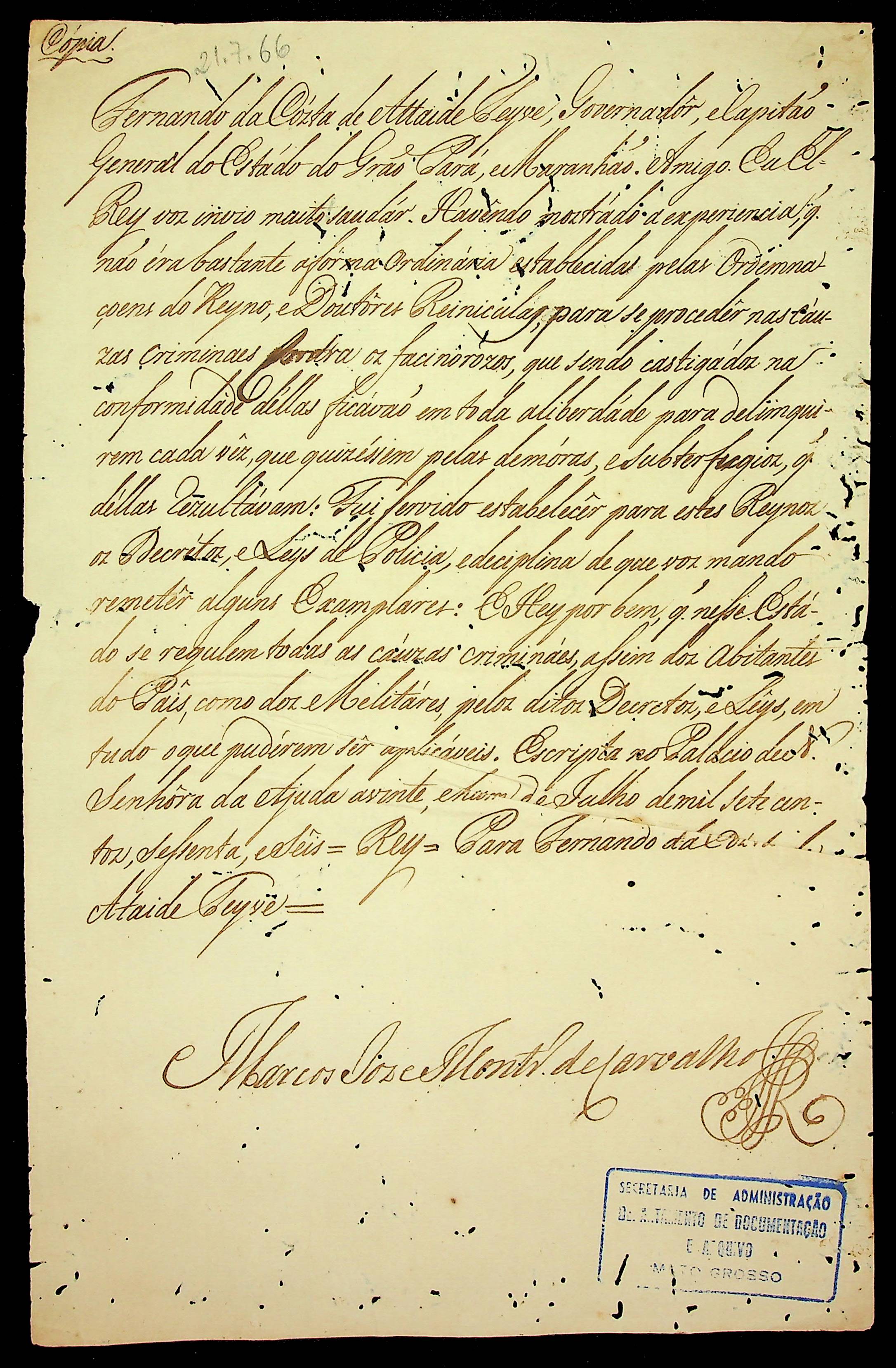 CARTA RÉGIA (cópia) do Rei [D. José I] ao Governador e Capitão-General da Capitania do Grão-Pará e Maranhão Fernando da Costa Ataíde Teive.