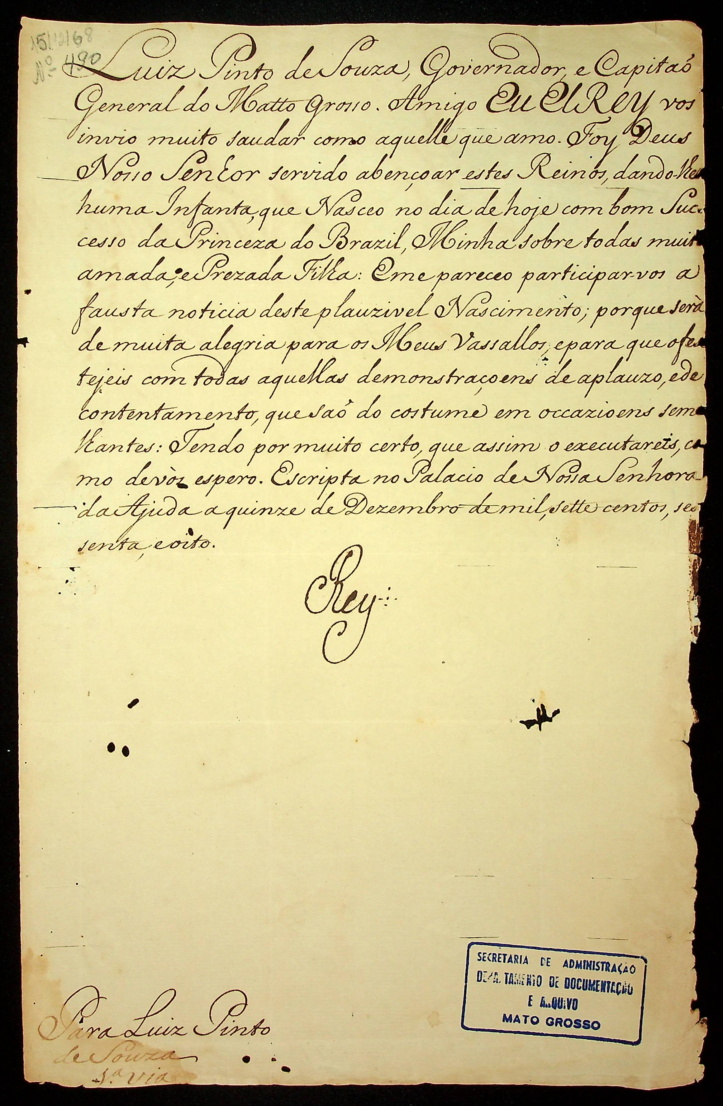 CARTA RÉGIA do Rei Dom José I ao Governador e Capitão-General da Capitania de Mato Grosso Luís Pinto de Souza Coutinho.