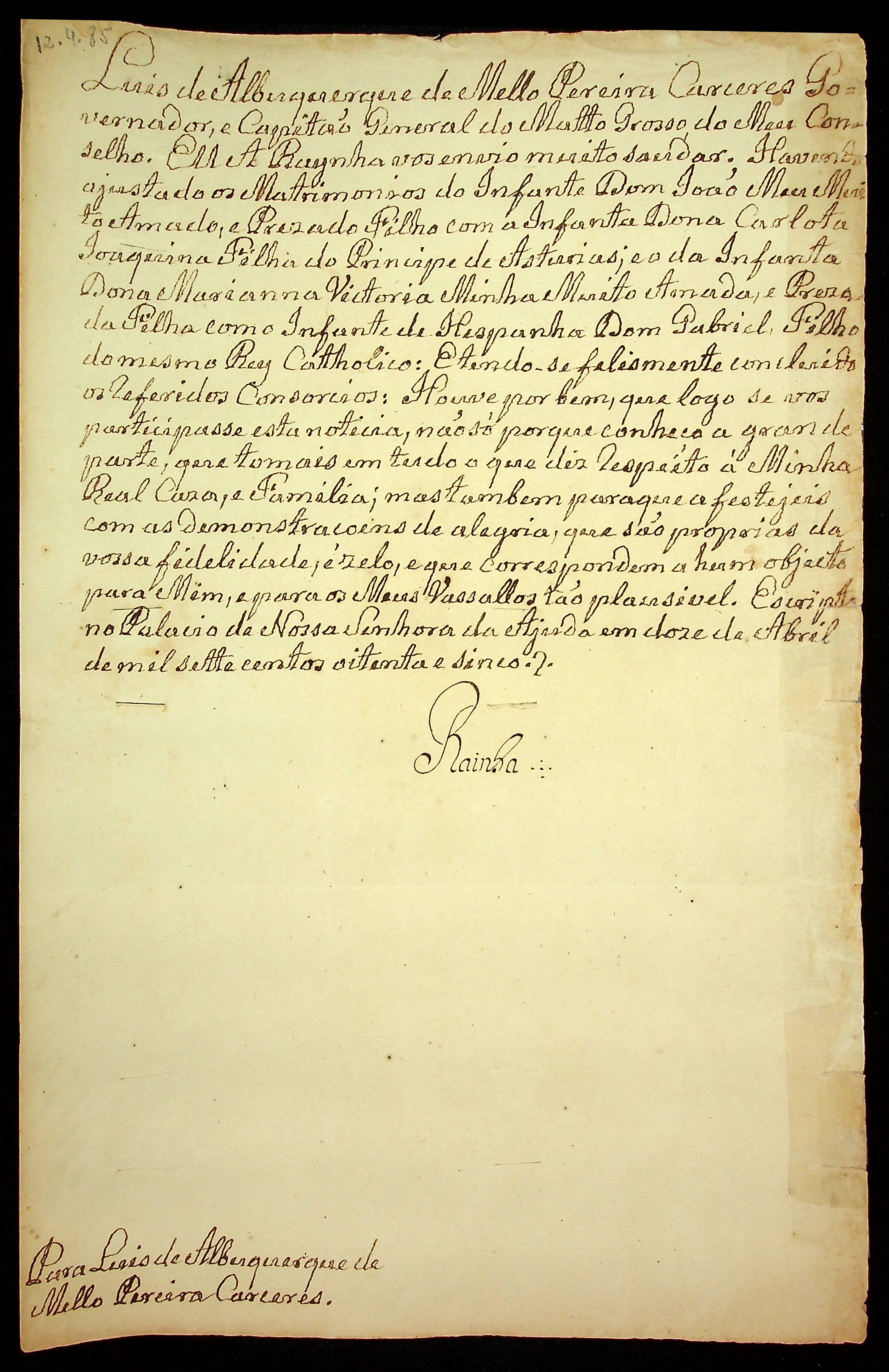 CARTA RÉGIA da Rainha D. Maria I ao Governador e Capitão-General da Capitania de Mato Grosso Luiz de Albuquerque de Melo Pereira e Cáceres.
