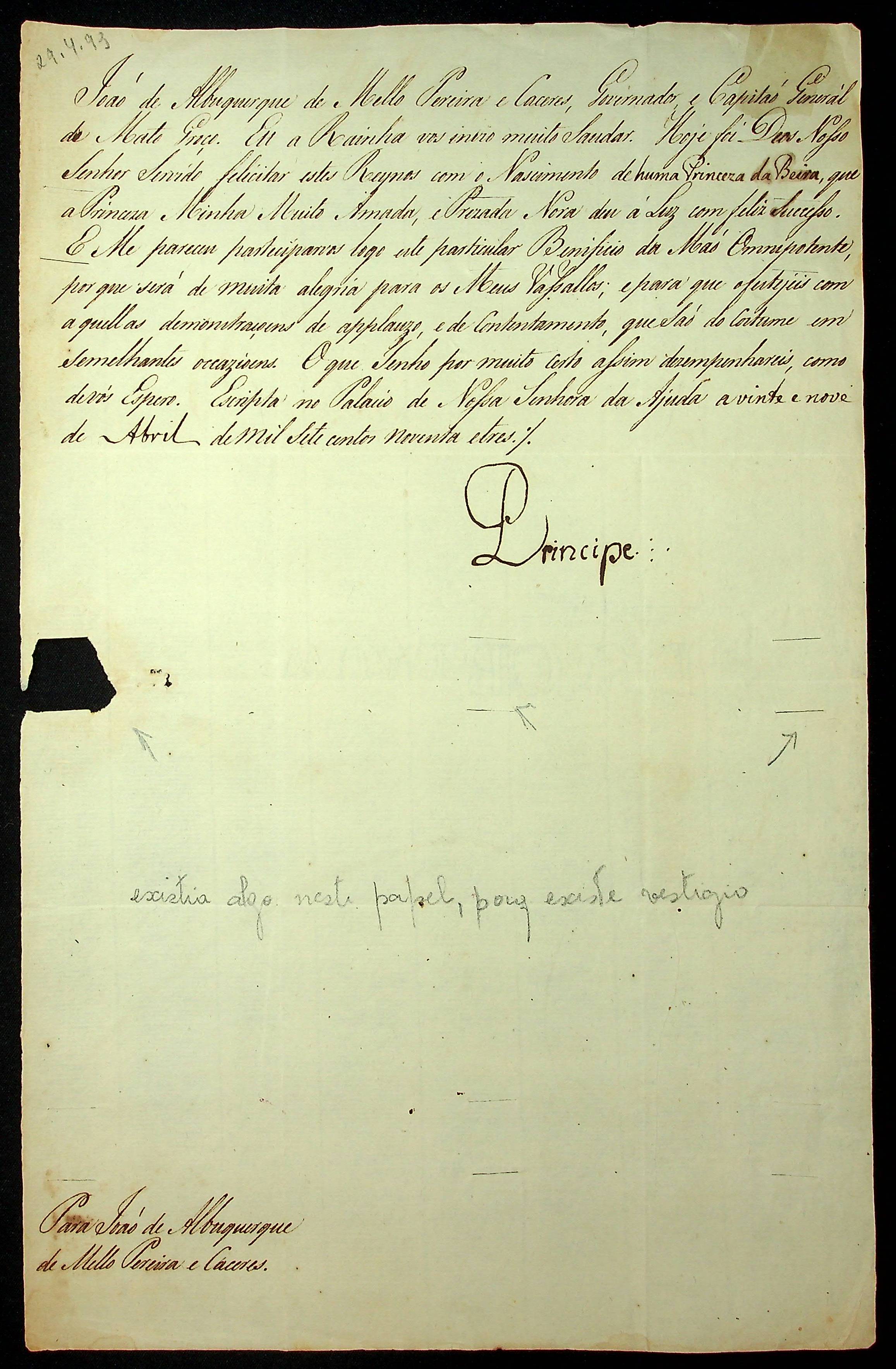 CARTA RÉGIA da Rainha Dona Maria, informando o nascimento da Princesa da Beira ao Governador e Capitão-General da Capitania de Mato Grosso João de Albuquerque de Melo Pereira e Cáceres.
