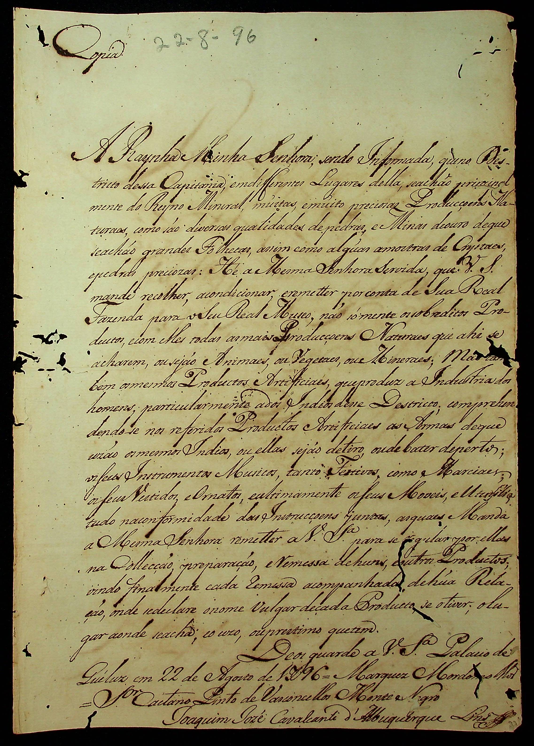 CARTA RÉGIA (Cópia) do Marques Mordomo - Mor ao Governador e Capitão-General da Capitania de Mato Grosso Caetano Pinto de Miranda Vasconcelos e Montenegro.