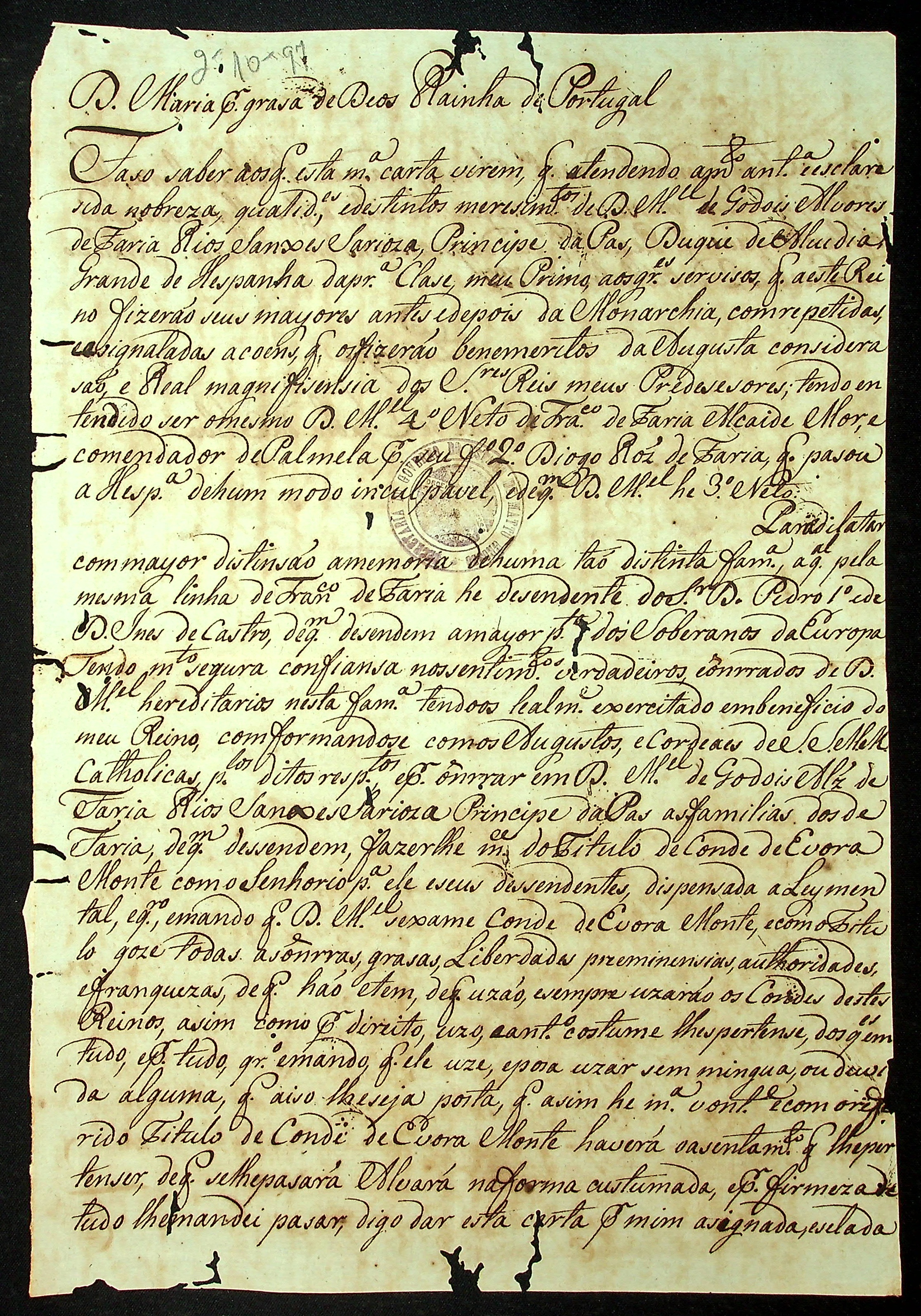 CARTA RÉGIA da Rainha de Portugal D. Maria versa sobre a nobreza de D. Manoel de Godoi Alvares de Faria Rios Sanches Sarioza.