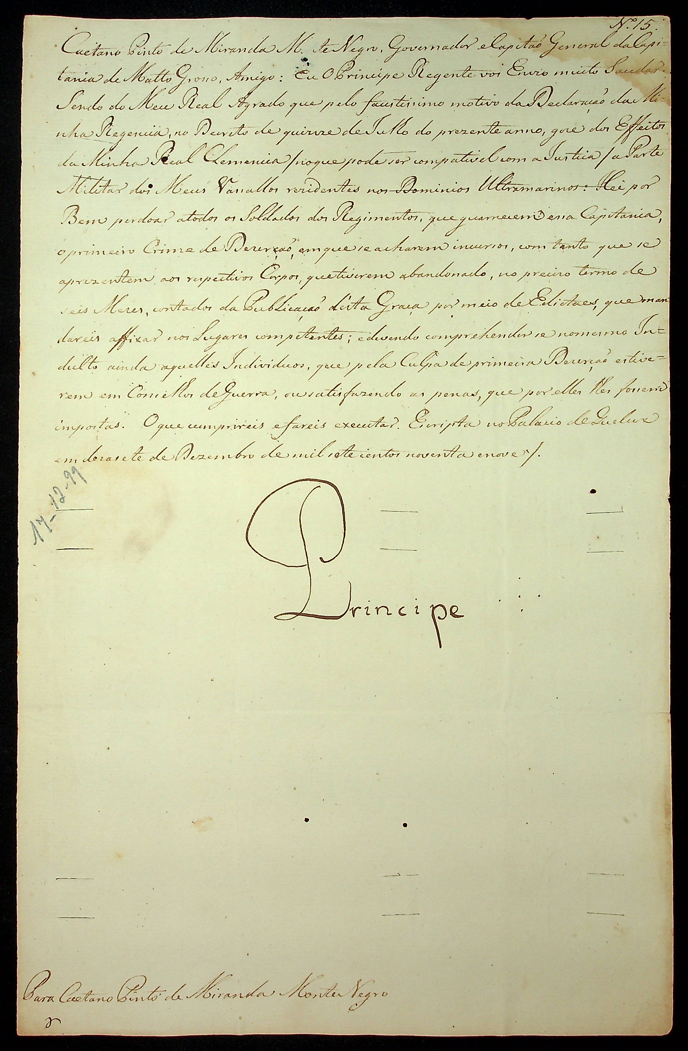CARTA RÉGIA do Príncipe Regente [D. João VI] ao Governador e Capitão-General da Capitania de Mato Grosso Caetano Pinto de Miranda e Montenegro.