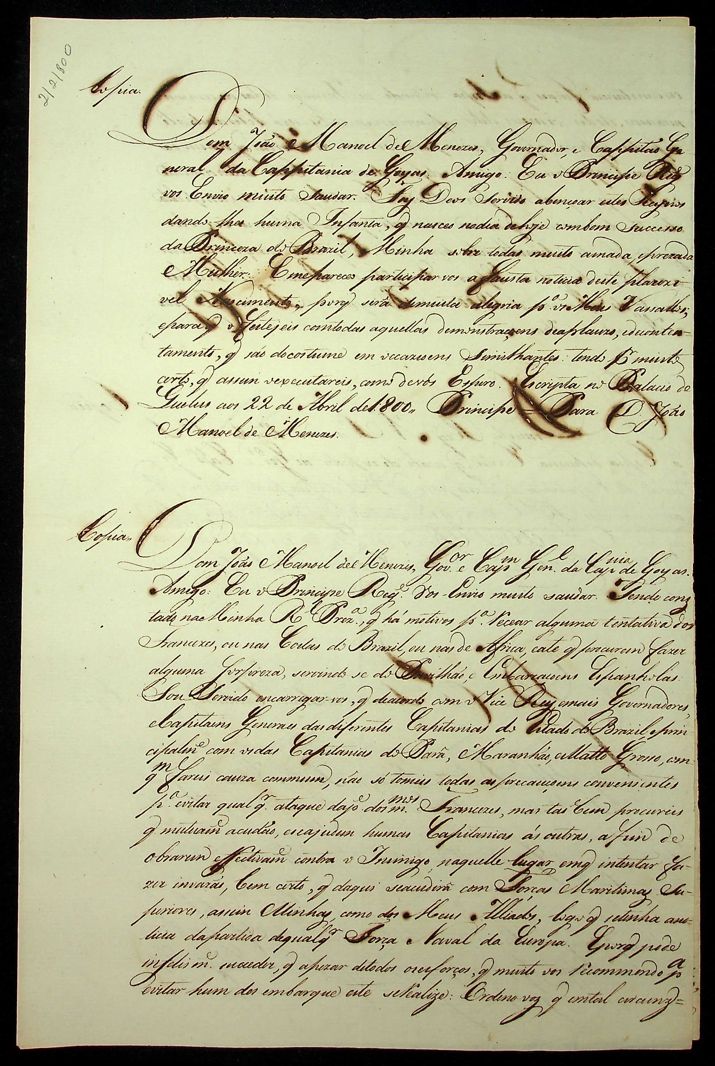 CARTA RÉGIA (conjunto de cópias) do Príncipe Regente [D.João VI] ao Governador e Capitão-General da Capitania de Goiás João Manoel de Meneses.