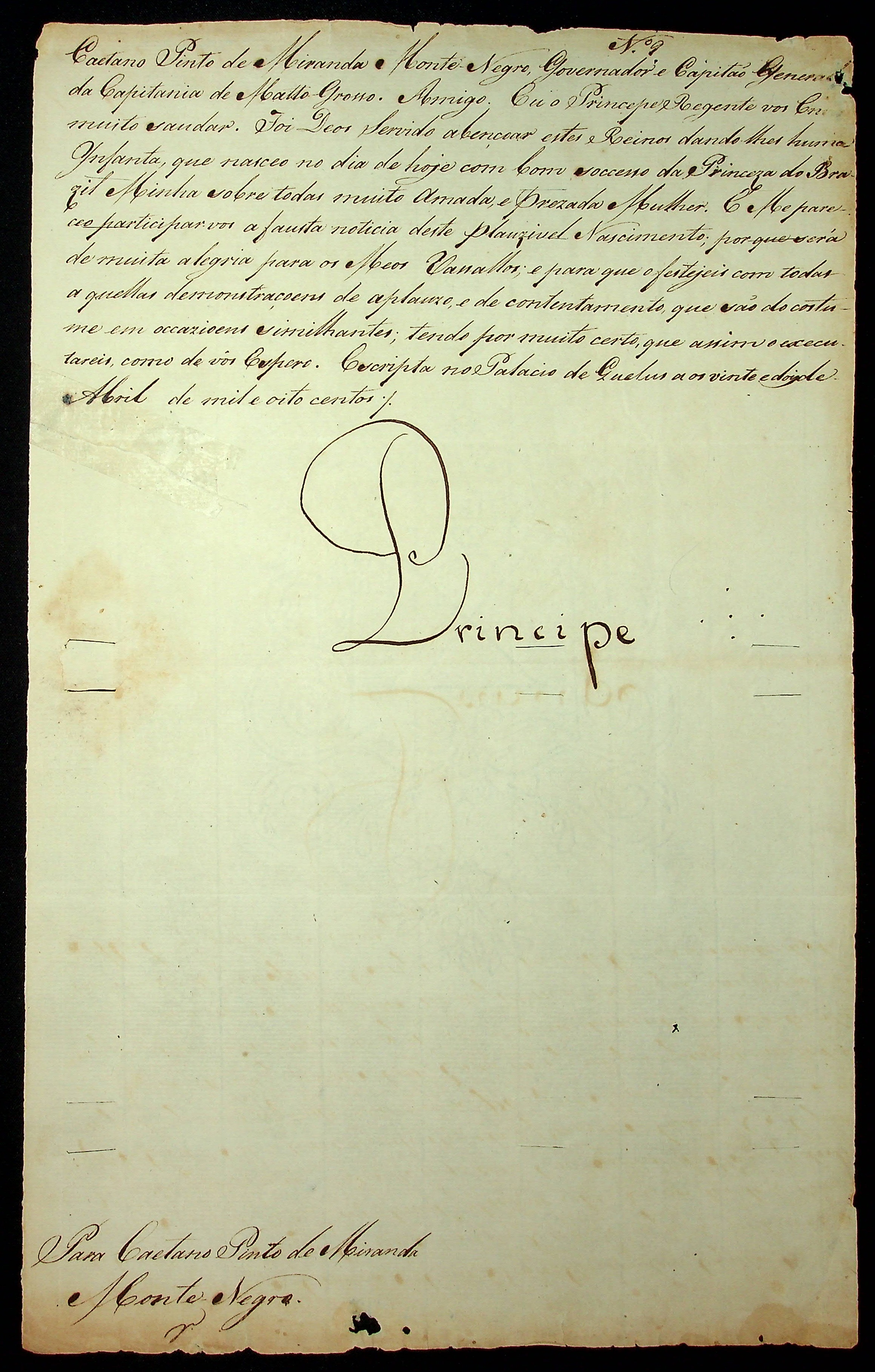 CARTA RÉGIA do Príncipe Regente [D.João VI] ao Governador e Capitão-General da Capitania de Mato Grosso Caetano Pinto de Miranda Montenegro.