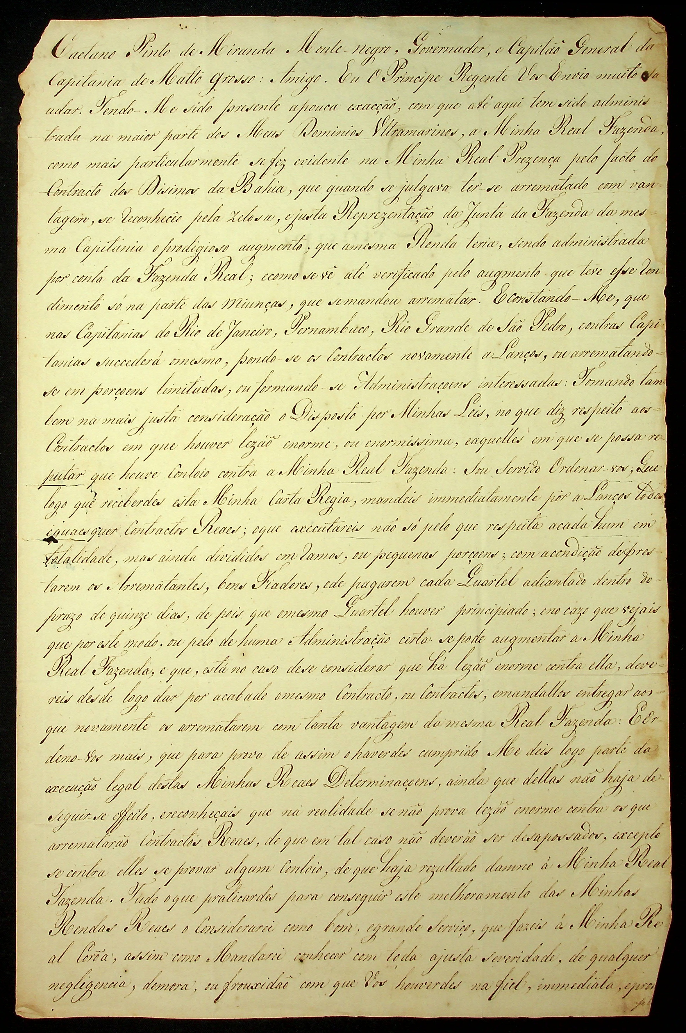 CARTA RÉGIA do Príncipe Regente [Dom João] ao Governador e Capitão General da Capitania de Mato Grosso Caetano Pinto de Miranda e Montenegro.