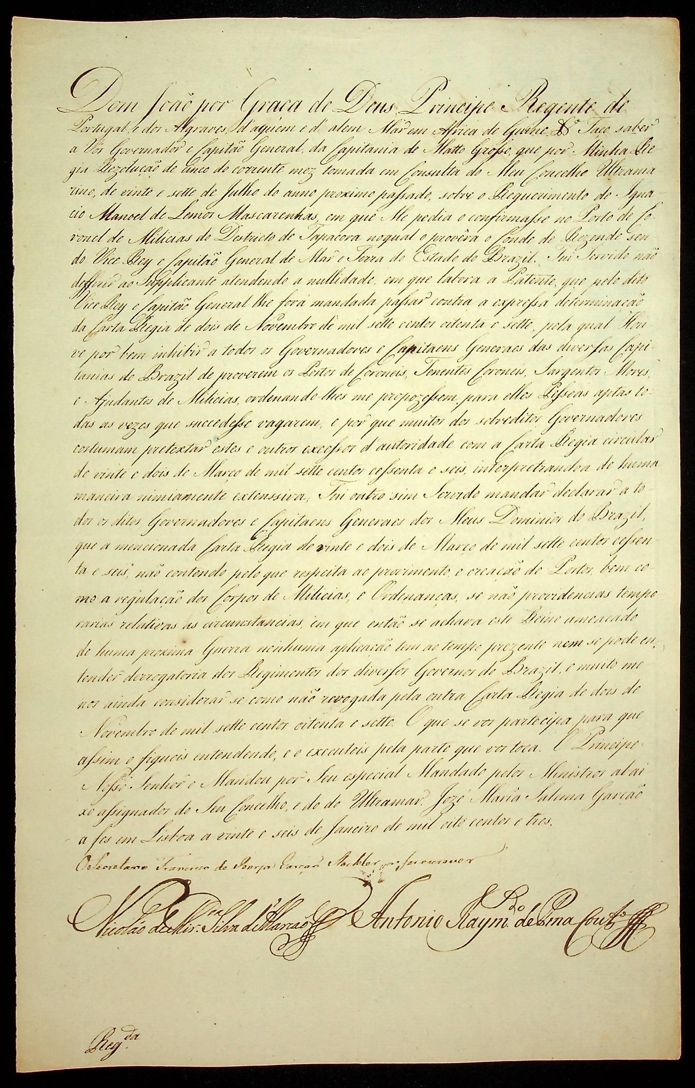 CARTA RÉGIA do Príncipe Regente D. João ao Governador e Capitão General da Capitania de Mato Grosso [Caetano Pinto de Miranda Montenegro].
