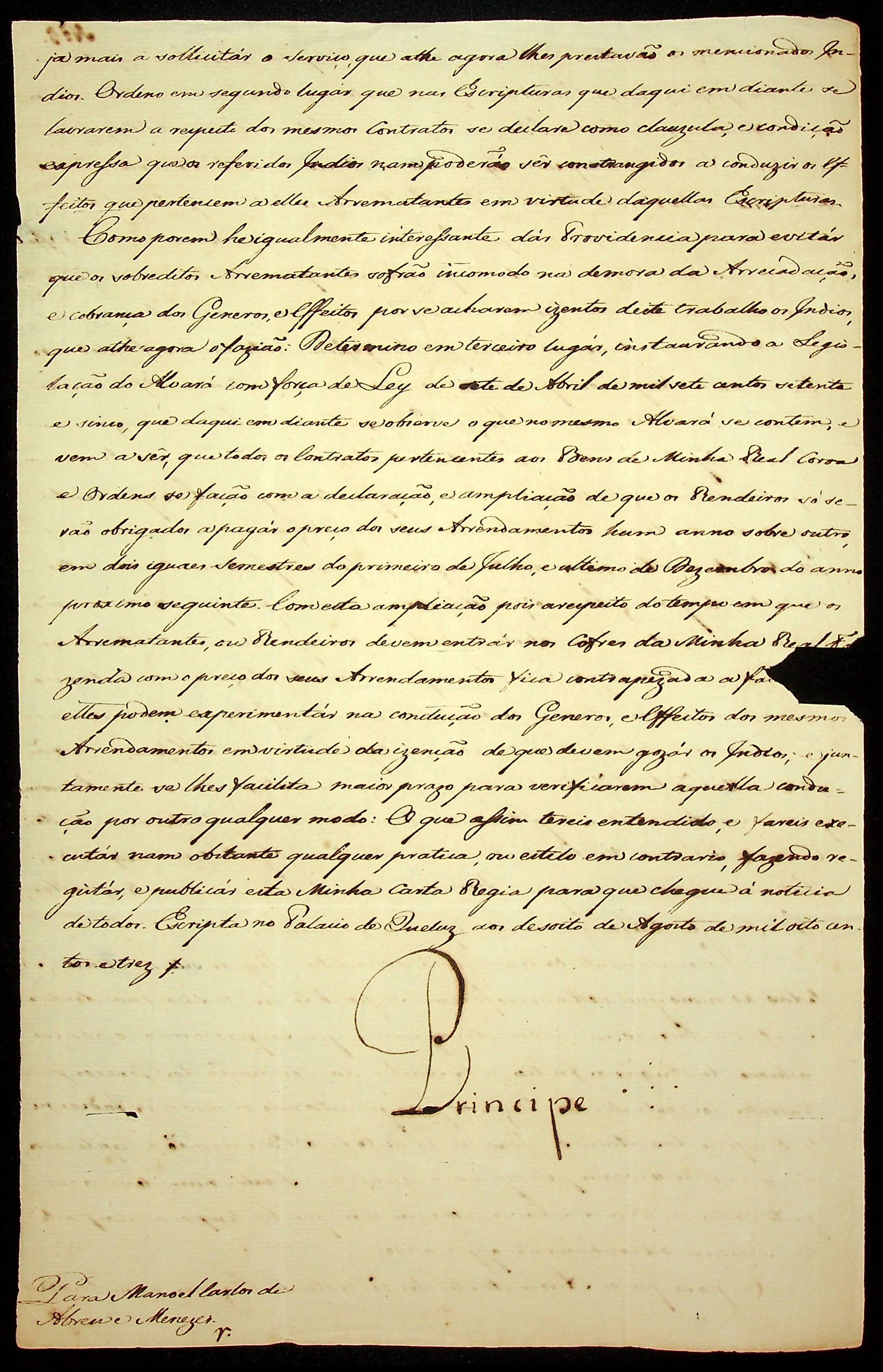 CARTA RÉGIA do Príncipe Regente [Dom João] ao Governador e Capitão-General da Capitania de Mato Grosso Manoel Carlos de Abreu e Menezes.