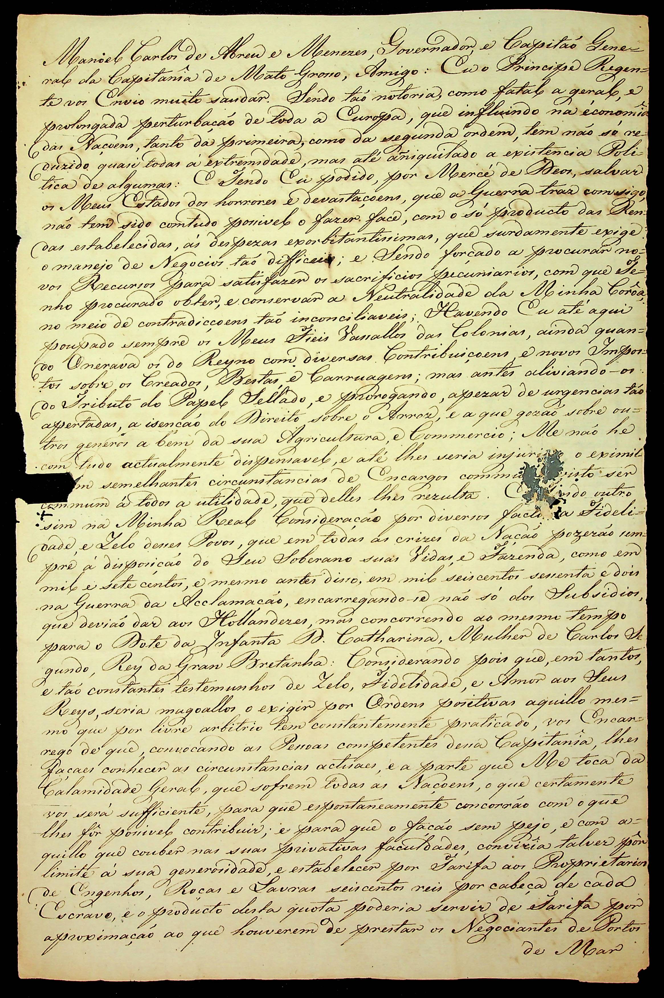 CARTA RÉGIA do Príncipe Regente D. João para o Governador e Capitão-General da Capitania de Mato Grosso Manoel Carlos de Abreu e Menezes.