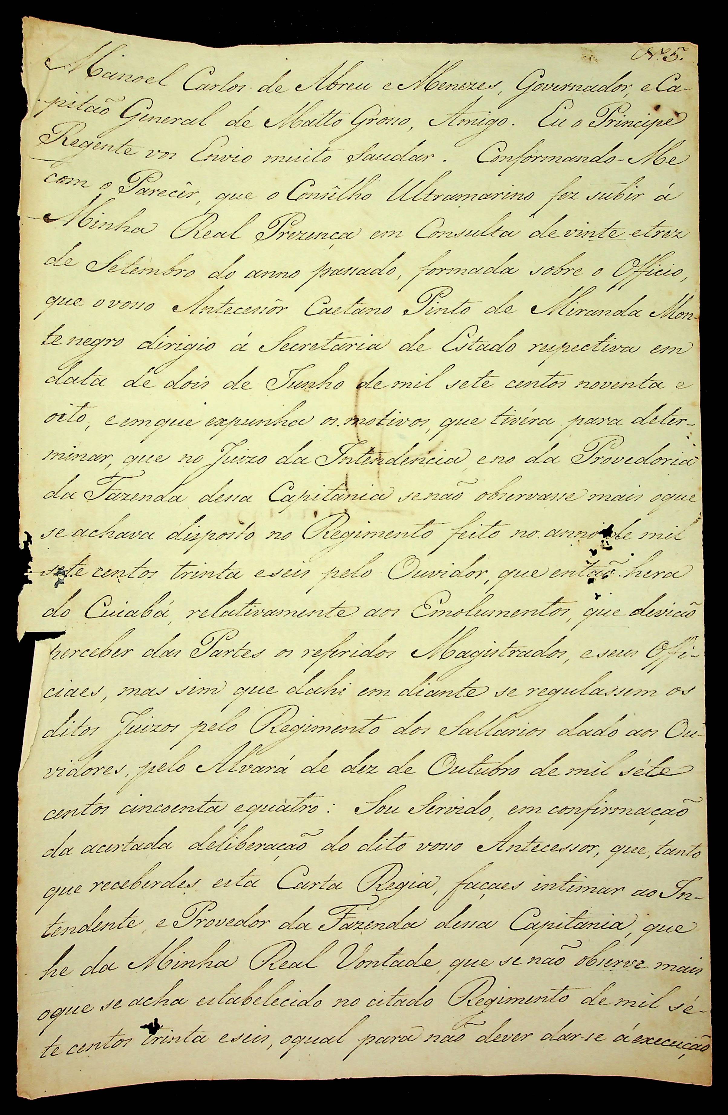 CARTA RÉGIA do Príncipe Regente D. João enviada para o Governador e Capitão-General da Capitania de Mato Grosso Manoel Carlos de Abreu e Menezes.