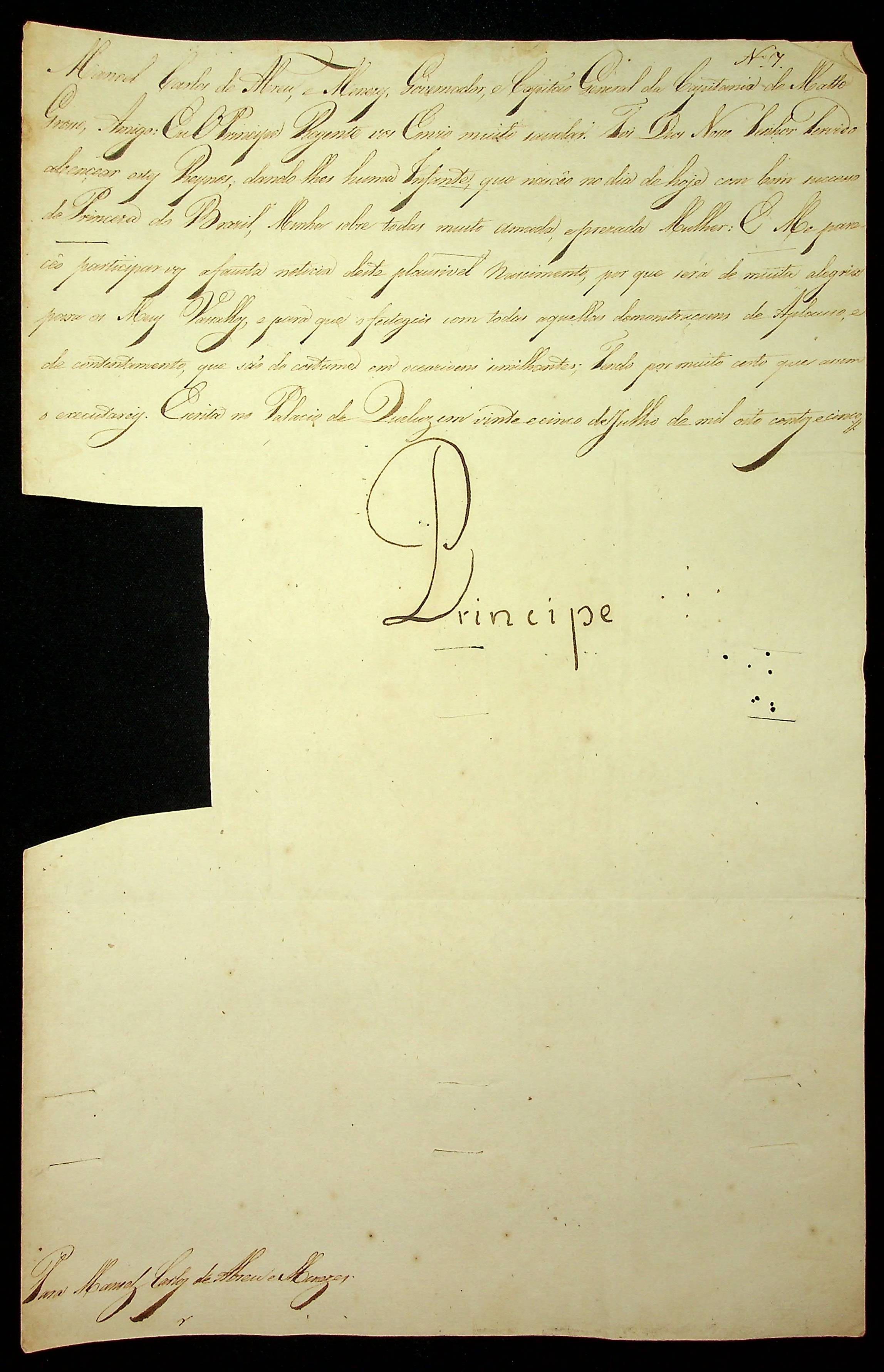 CARTA RÉGIA expedida pelo Príncipe Regente Dom João ao Governador e Capitão-General da Capitania de Mato Grosso Manoel Carlos de Abreu e Menezes.