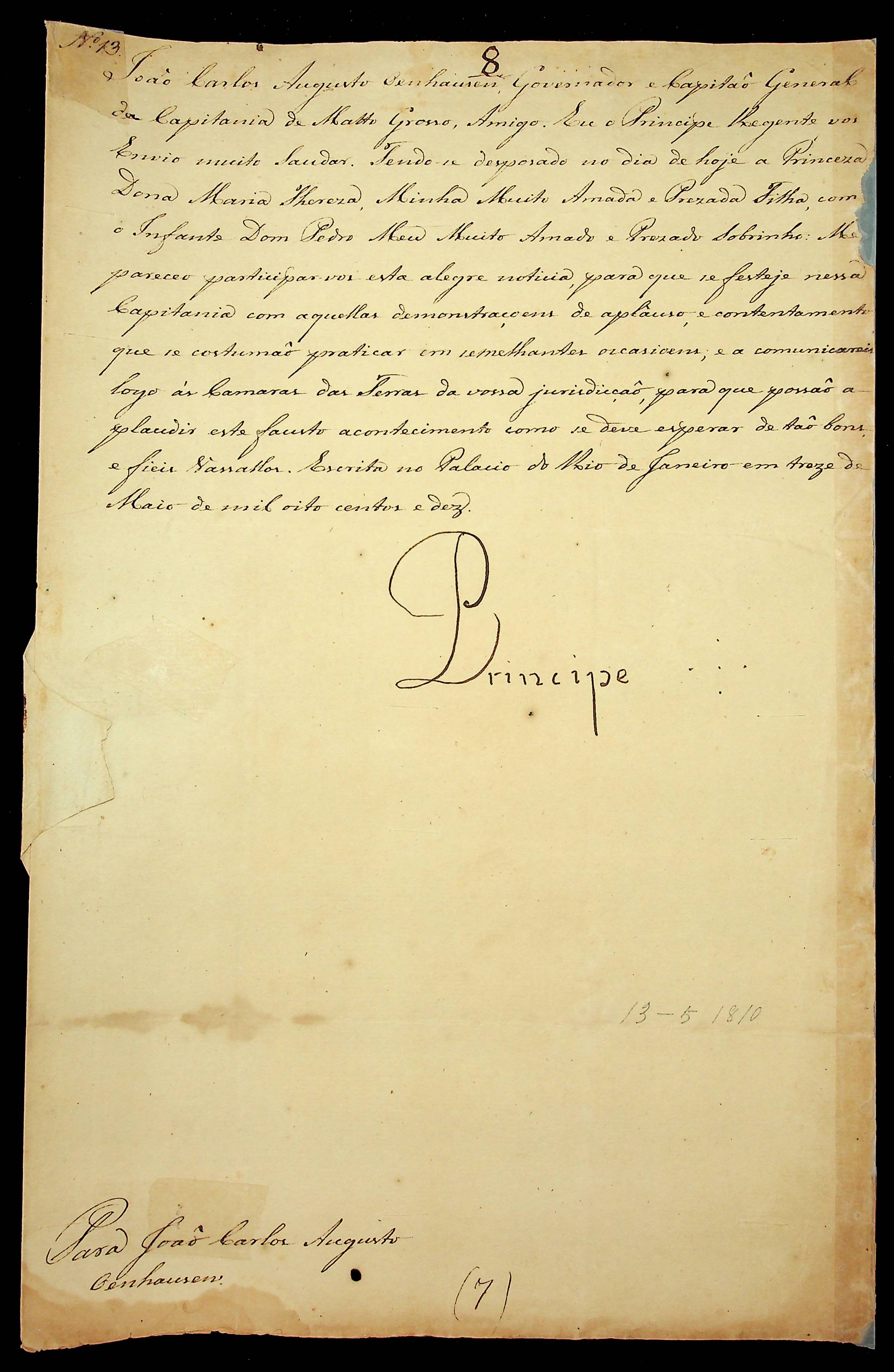 CARTA RÉGIA do Príncipe Regente [D. João] para o Governador e Capitão-General da Capitania de Mato Grosso João Carlos Augusto de Oyenhausen e Gravemberg.