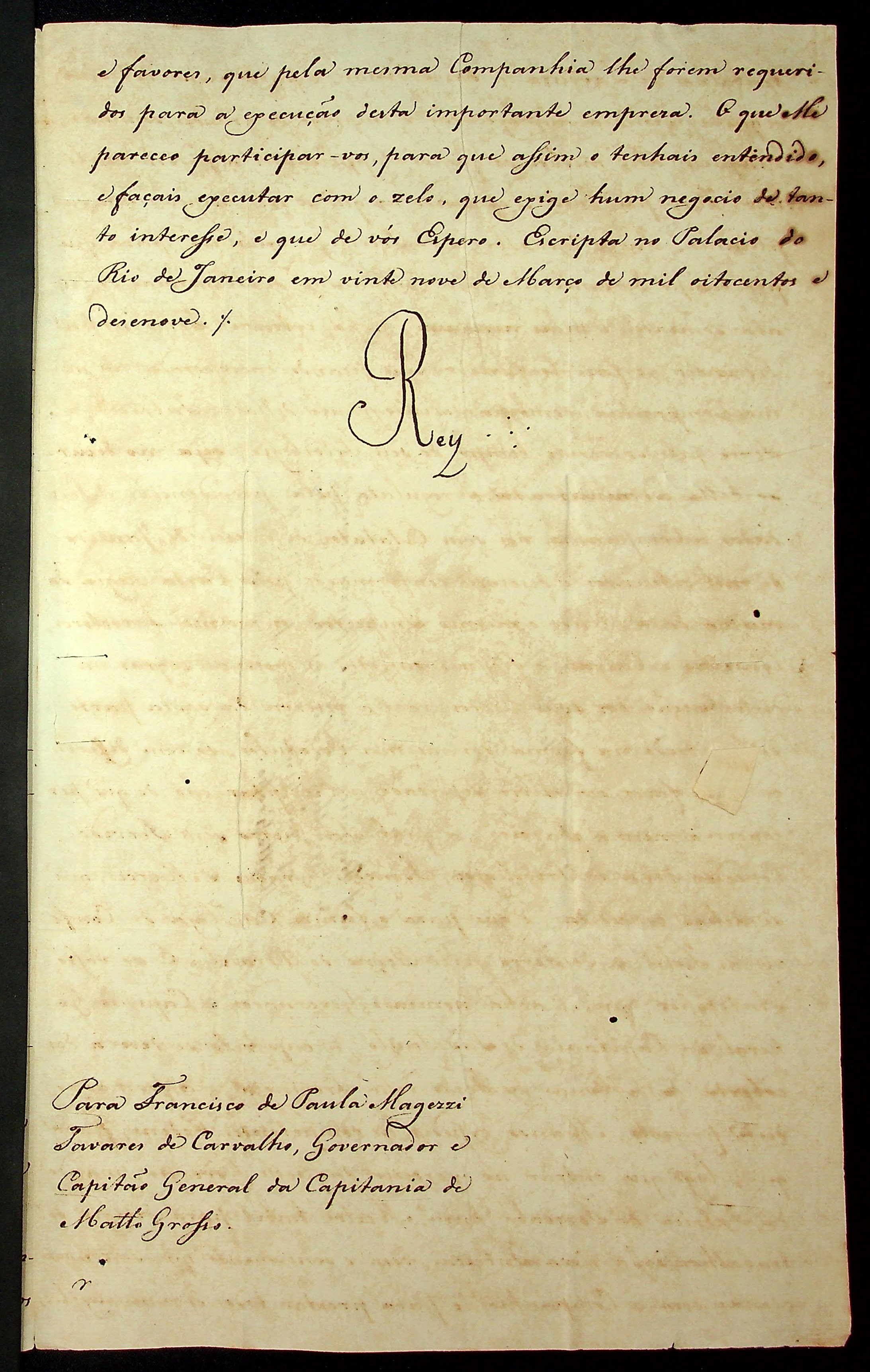 CARTA RÉGIA do Rei [D. João VI] ao Governador e Capitão General da Capitania de Mato Grosso Francisco de Paula Maggessi Tavares de Carvalho.