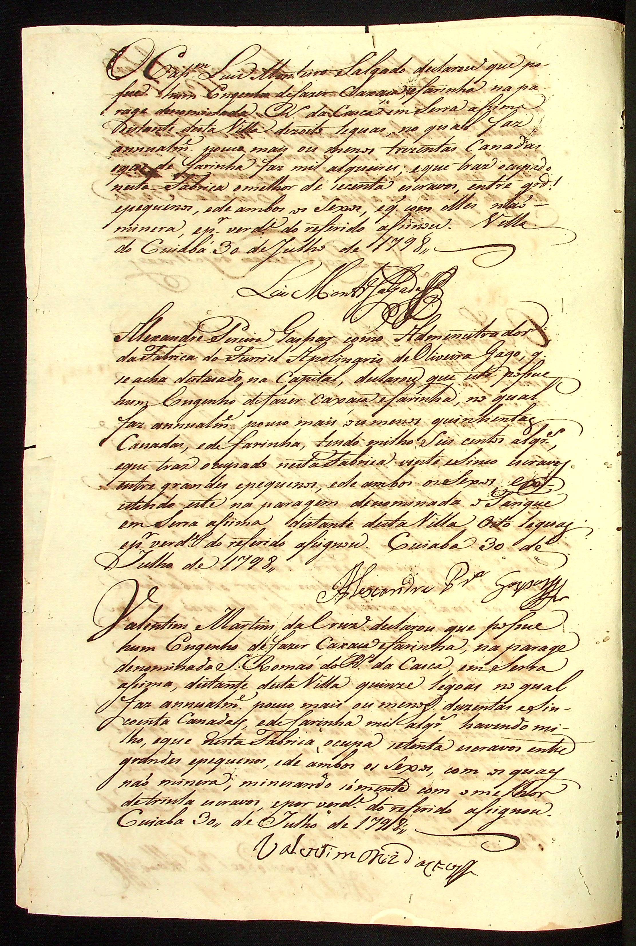 DECLARAÇÃO (conjunto) feita por todos os possuidores de Fábricas e Engenhos de fazer cachaça e farinha nas minas do Cuiabá.