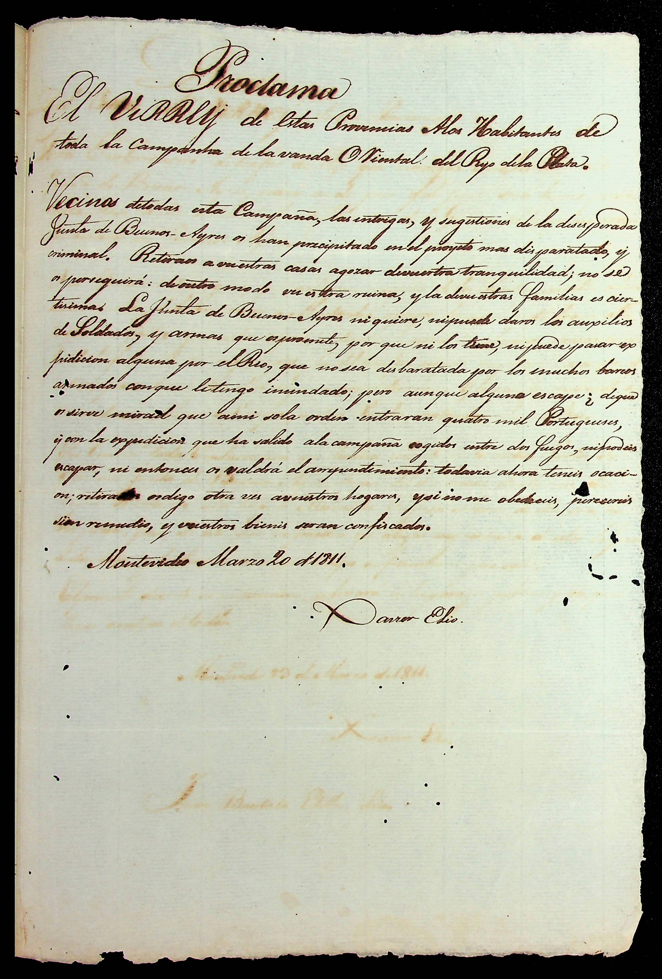 DECRETO do Vice-Rei da Província de [Montevideo] informando que toda embarcação de tráfico do rio que Navegue com patente da Junta de Buenos Aires serão presas.