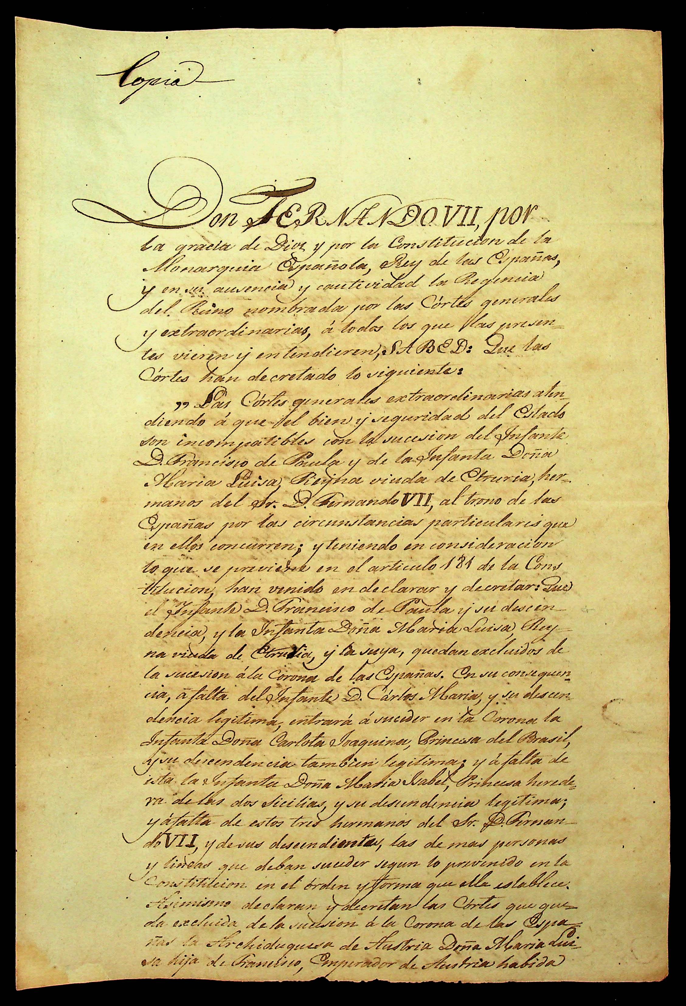 DECRETO do Rei da Espanha Dom Fernando VII sobre a sucessão da Coroa Espanhola.