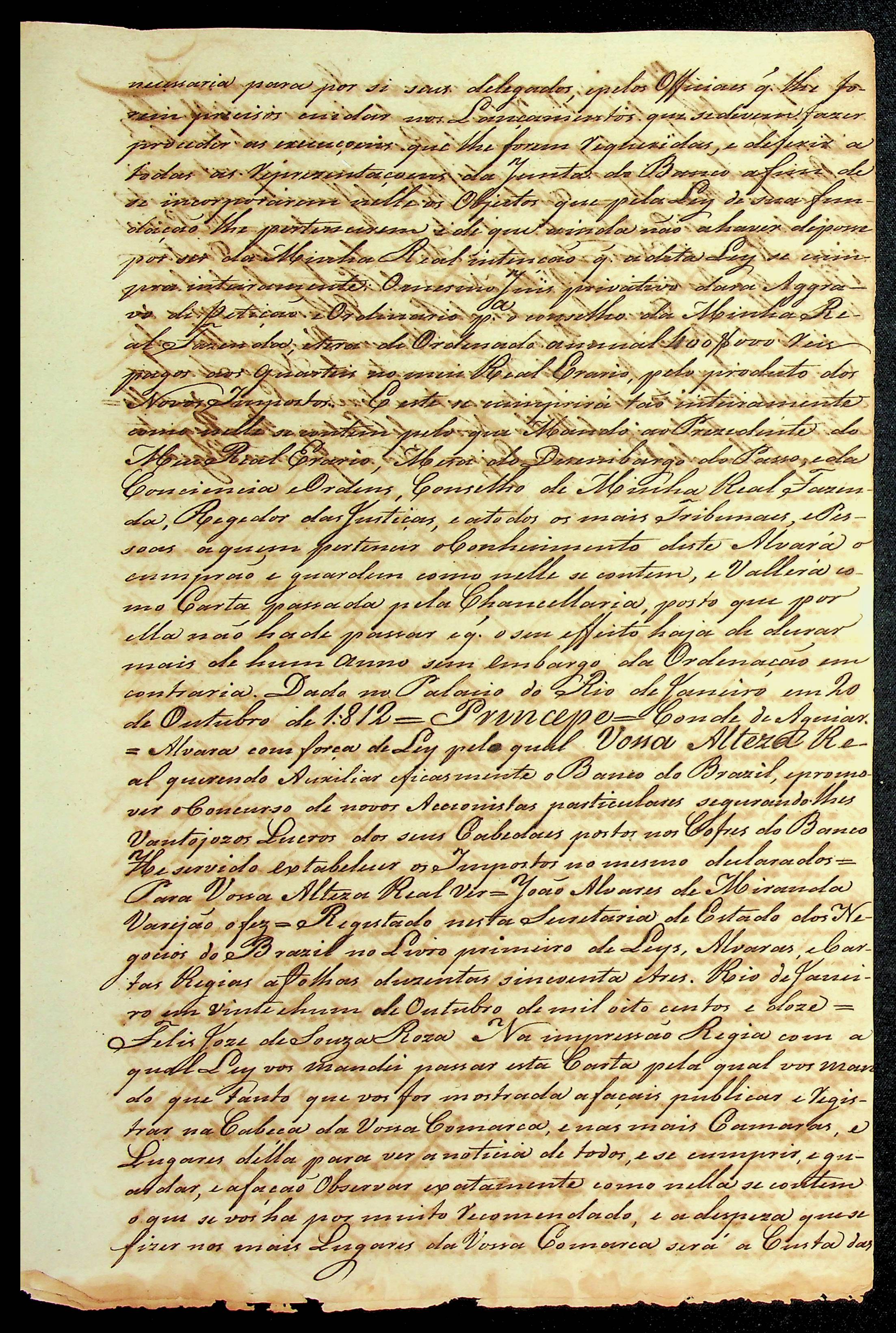 DECRETO do Príncipe Regente D. João criando o Banco do Brasil.