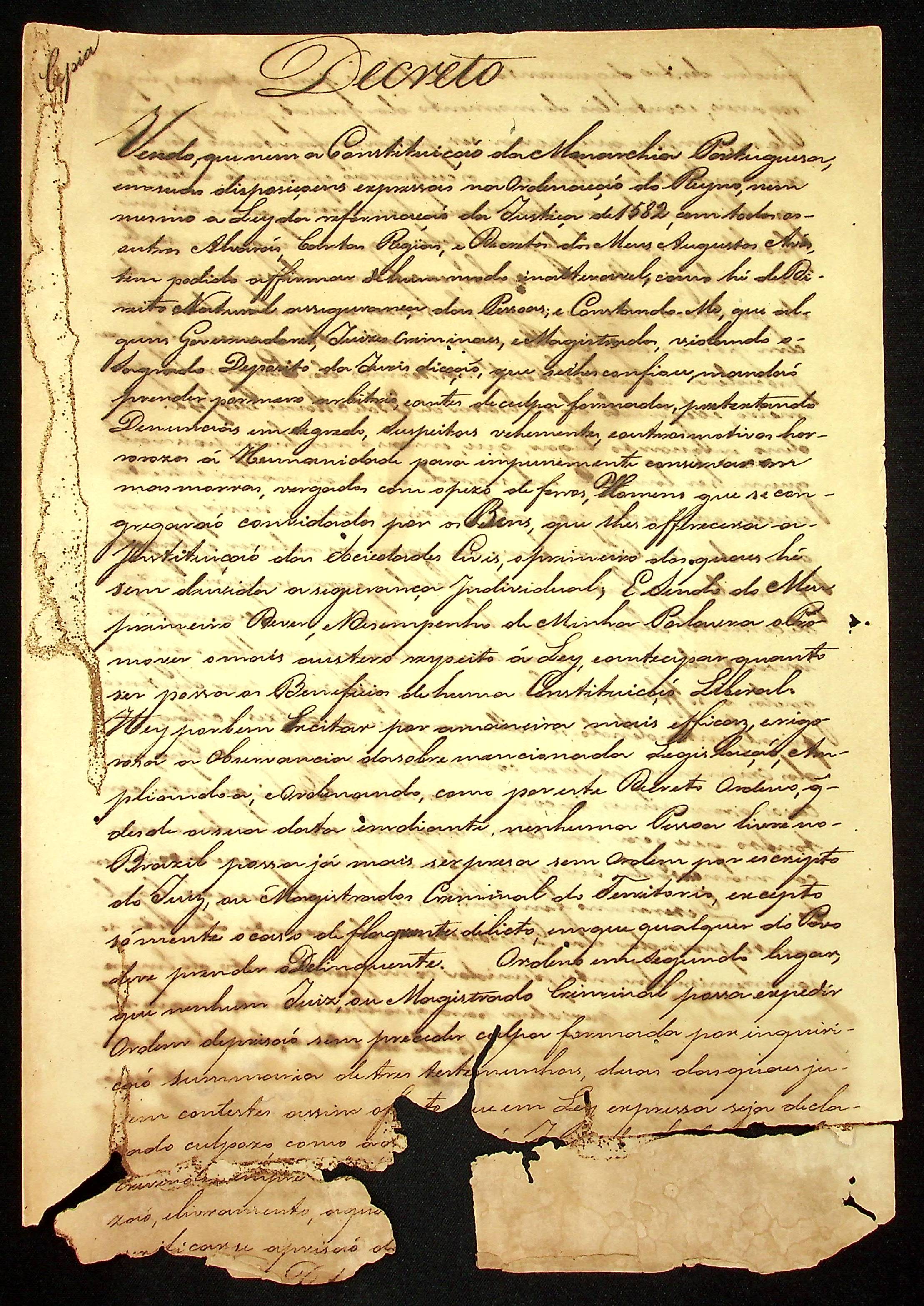 DECRETO (cópia) expedido pelo Príncipe Regente [D. Pedro] proibindo prisões abusivas.