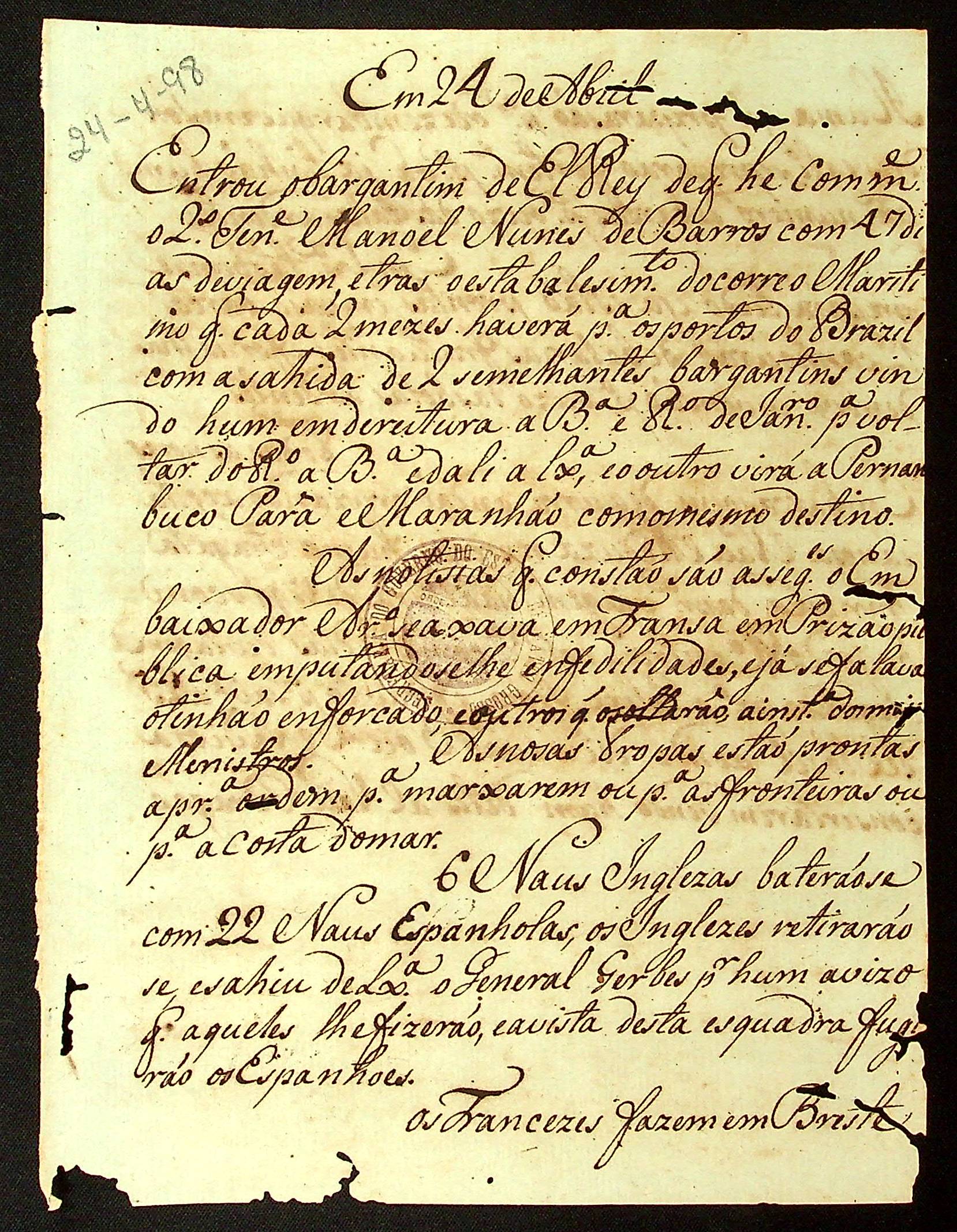 GAZETA - informa sobre: estabelecimento marítimo, notícia de embaixador, embarcações inglesas, entre outras.