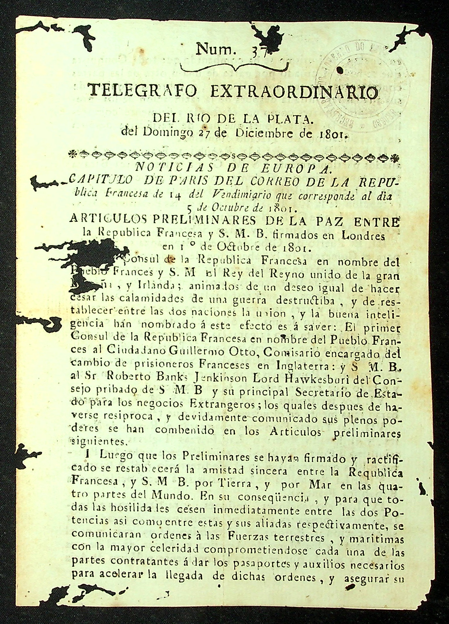 GAZETA Telegrafo Extraordinário com notícias da Europa trazendo capítulo de Paris do Correio da República.