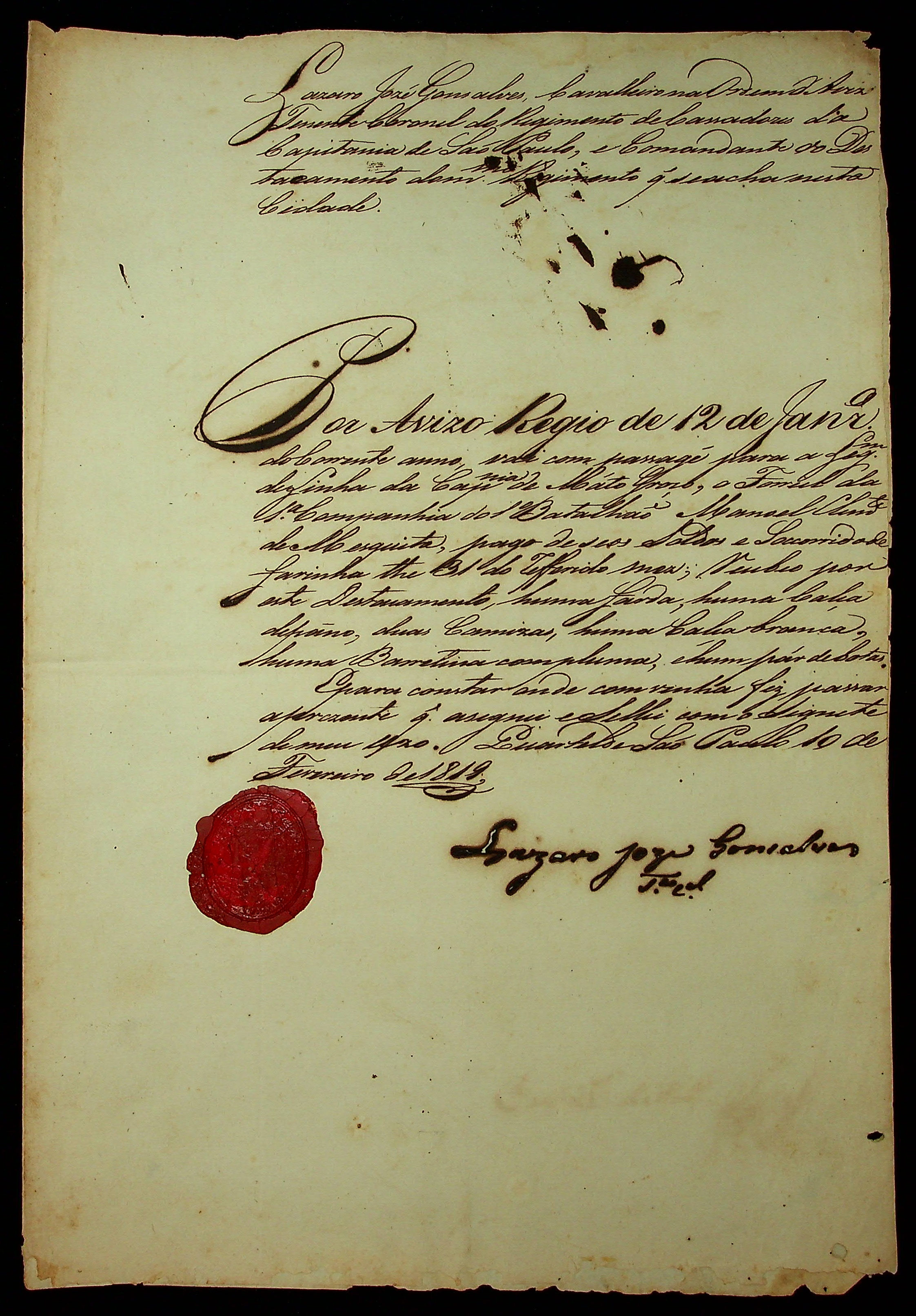 GUIA de passagem expedido pelo Brigadeiro dos Reais Exércitos, Chefe do Regimento de Caçadores da Capitania de São Paulo Candido Xavier de Almeida e Souza à Manoel Clemente de Mesquita para compor a Legião de Linha da Capitania de Mato Grosso.