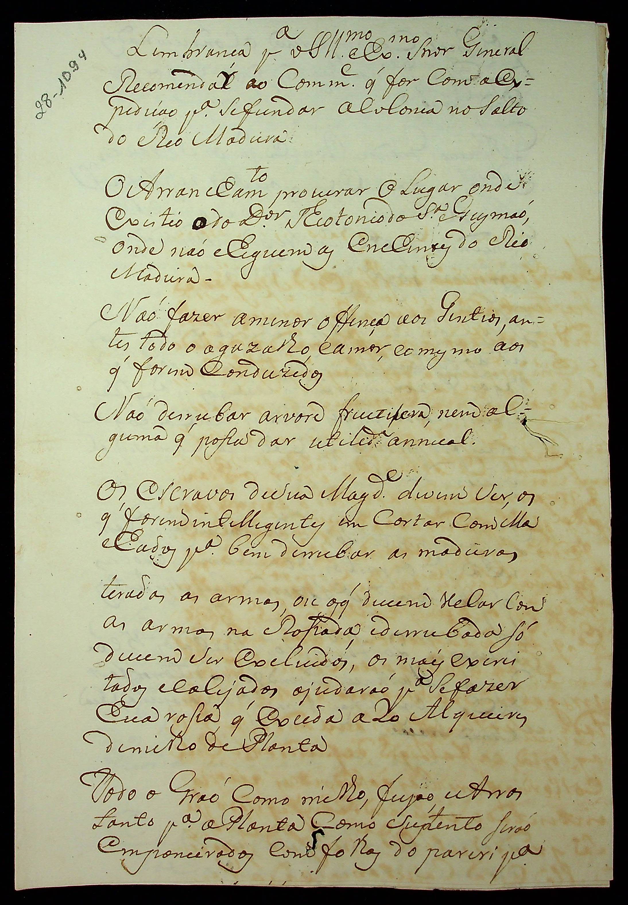INSTRUÇÃO - Lembrança para o Ilustríssimo Senhor General a recomendar ao Comandante que for com a expedição para fundar a colônia no Salto do Rio Madeira, passada por Manoel Joaquim Leite Pintiado.