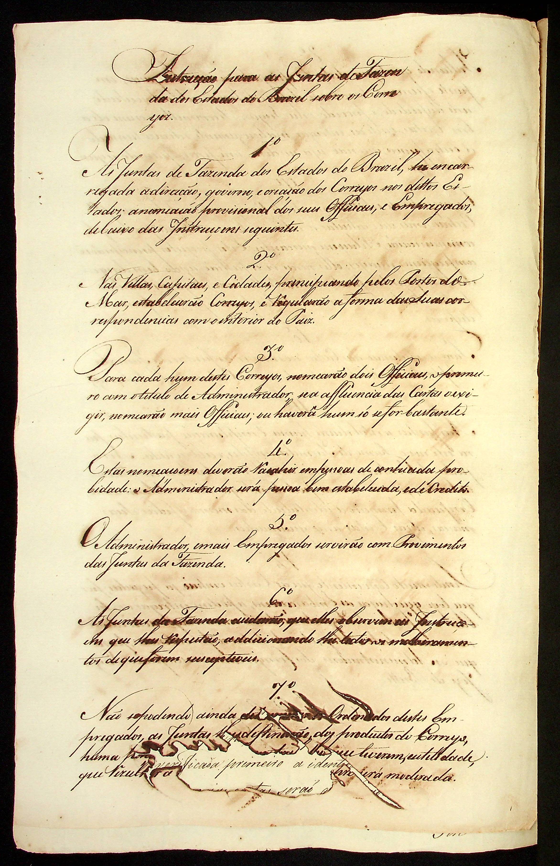 INSTRUÇÃO (conjunto) para os Correios do Reino, Correio da América, para as Juntas de Fazenda do Estado do Brasil sobre os Correios, para os Comandantes de Paquetes e para a remessa de encomendas pelos Paquetes Marítimos.