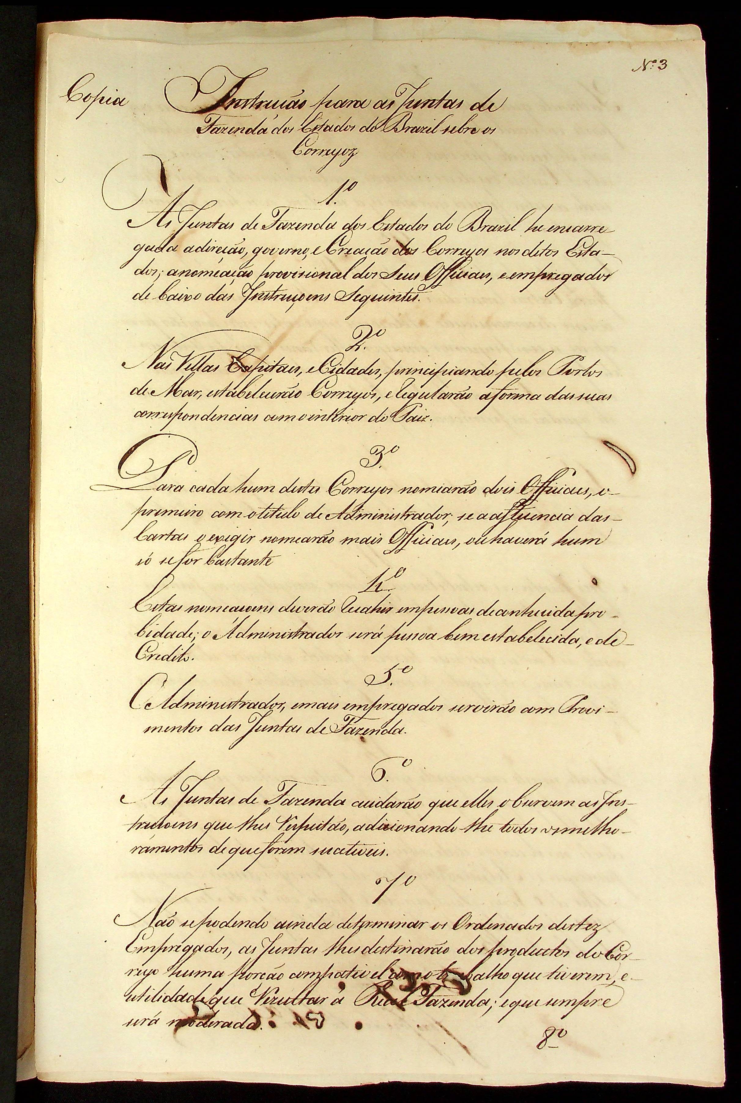 INSTRUÇÃO (conjunto) para os Correios do Reino, Correio da América, para as Juntas de Fazenda do Estado do Brasil sobre os Correios, para os Comandantes de Paquetes e para a remessa de encomendas pelos Paquetes Marítimos.