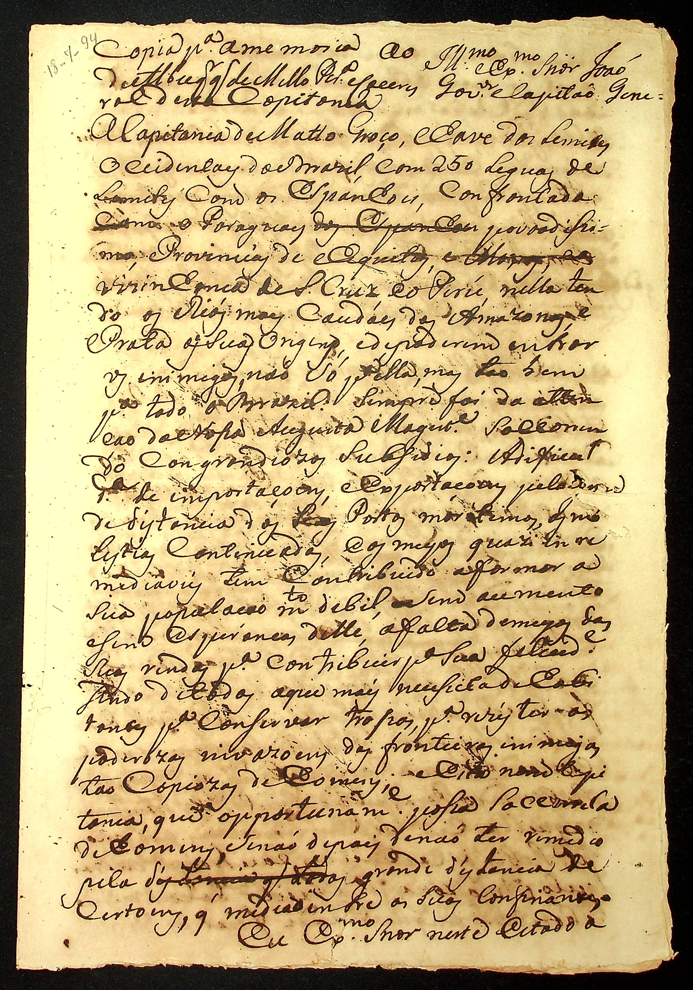 MEMÓRIA (Cópia) de Manoel Joaquim Leite Pintado ao Governador e Capitão-General da Capitania de Mato Grosso João de Albuquerque de Melo Pereira e Cáceres.