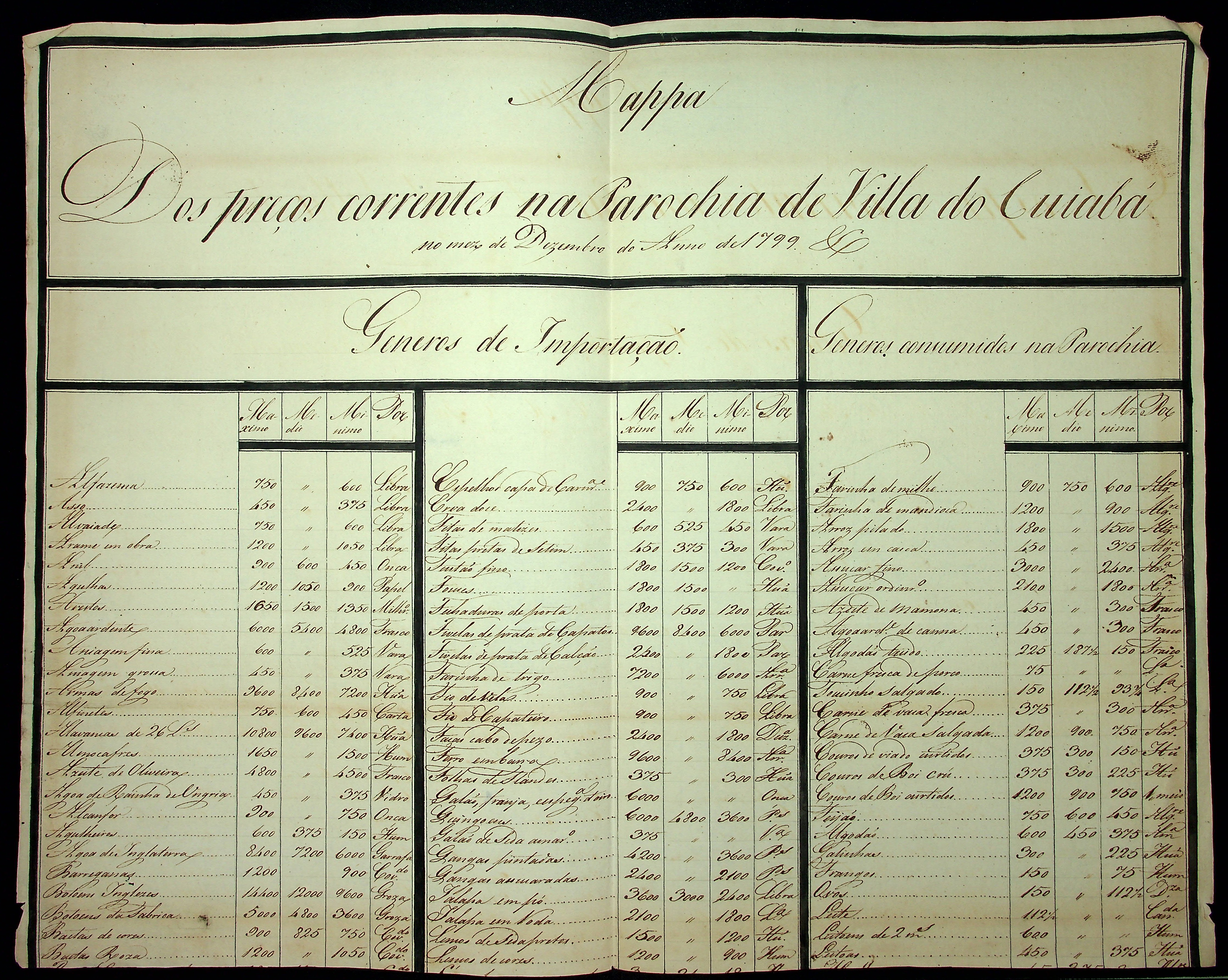 MAPA (incompleto) dos preços correntes dos gêneros importados e consumidos na Paróquia da Vila do Cuiabá.