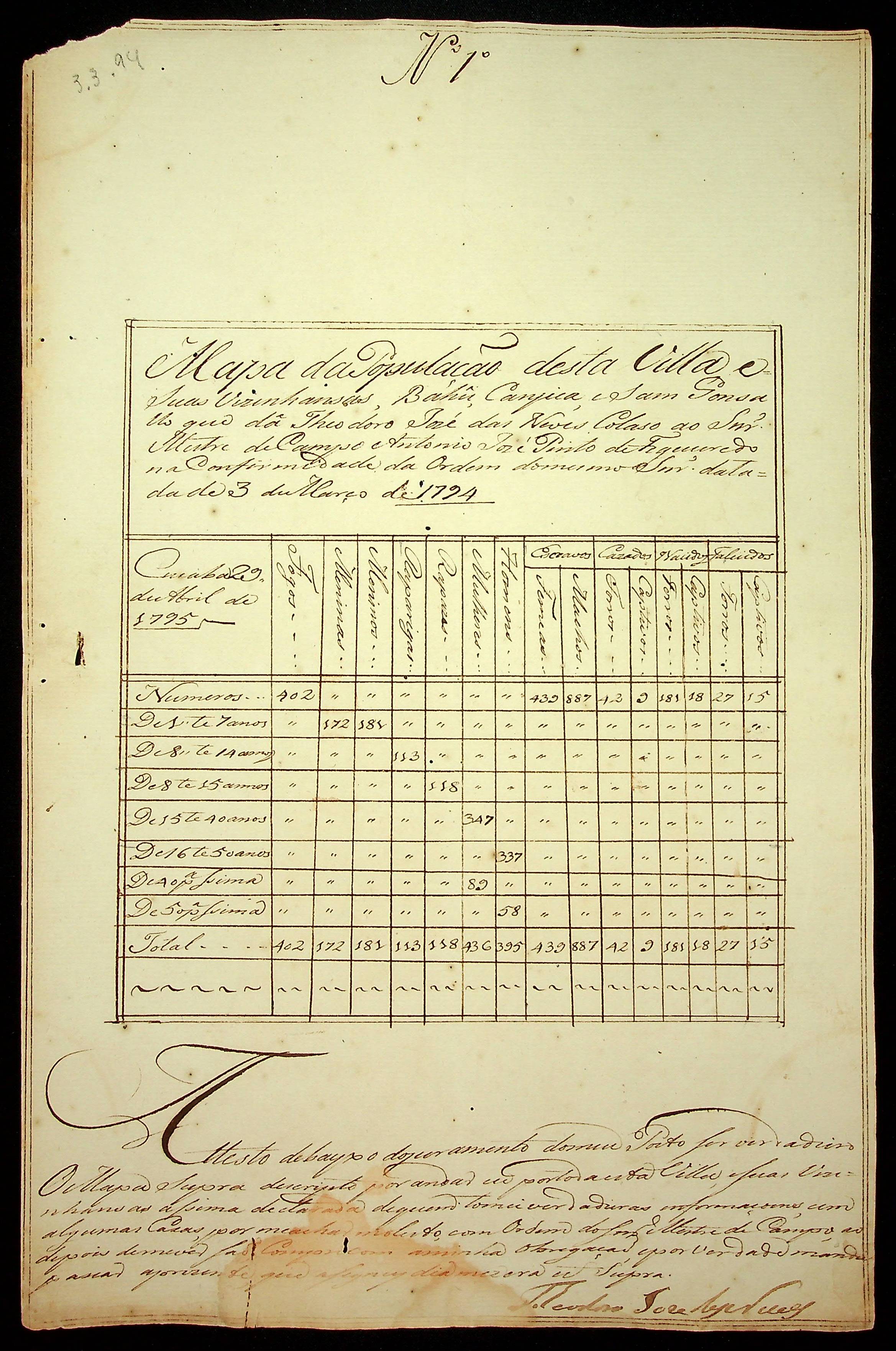 MAPA DE POPULAÇÃO da [Vila do Cuiabá] e suas vizinhanças, Bahú, Canjica e San Gonsallo que dá Theodoro José das Neves [Colaso] ao Mestre de Campo Antônio José Pinto de Figueiredo na conformidade da ordem do mesmo Sr. datada de 3 de março de 1794.