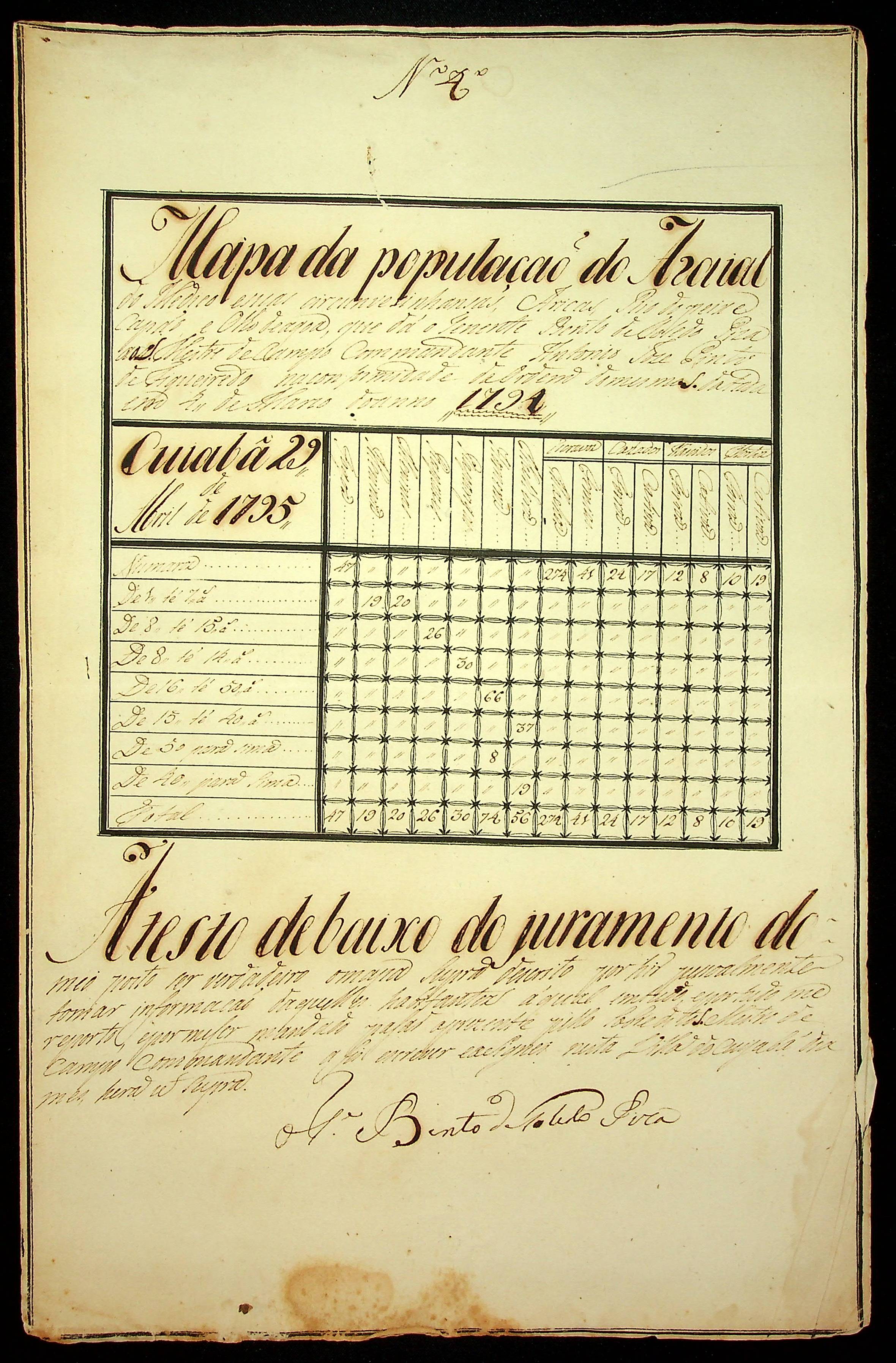 MAPA DE POPULAÇÃO da [Vila do Cuiabá] e suas vizinhanças, Bahú, Canjica e San Gonsallo que dá Theodoro José das Neves [Colaso] ao Mestre de Campo Antônio José Pinto de Figueiredo na conformidade da ordem do mesmo Sr. datada de 3 de março de 1794.