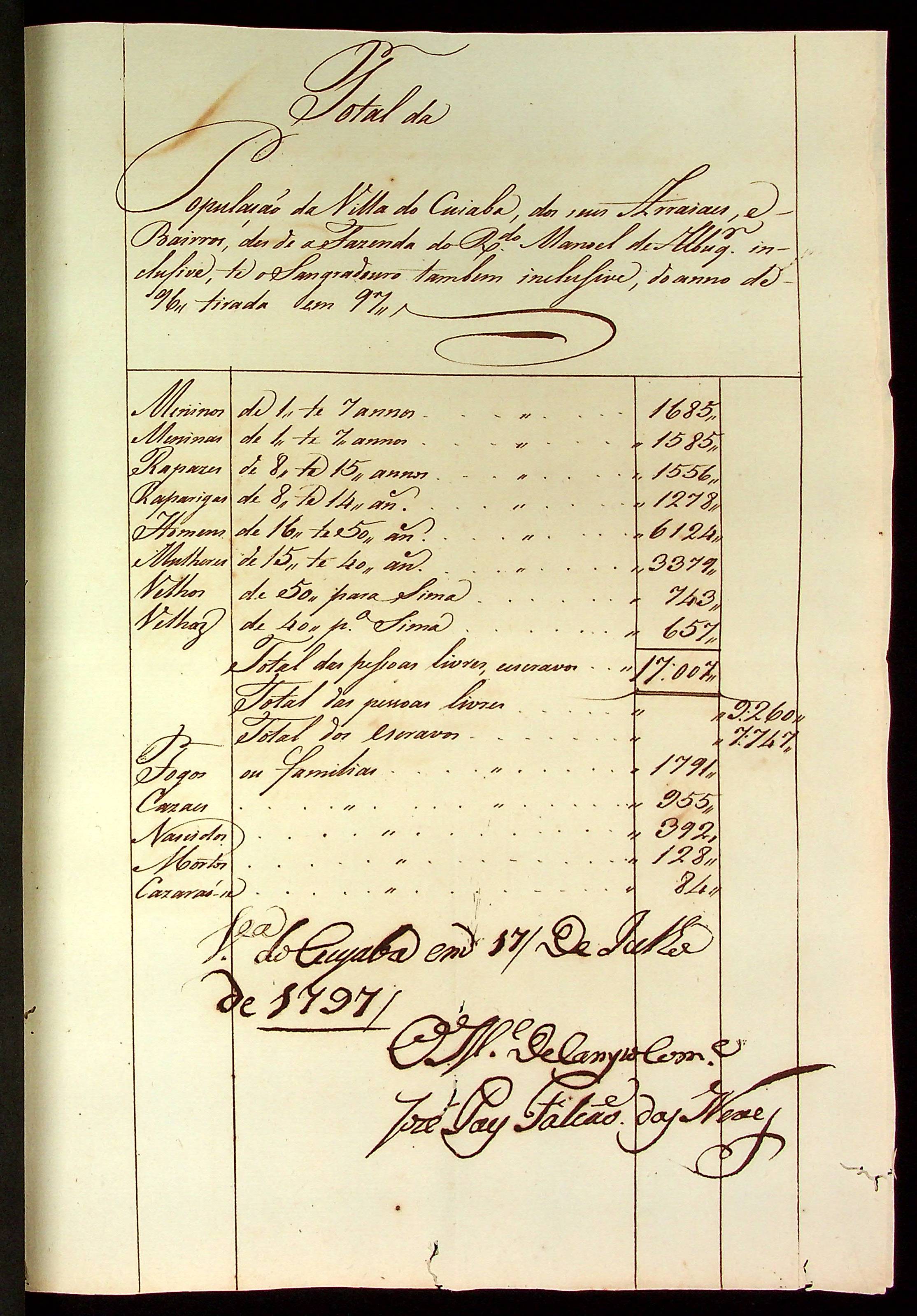 MAPA de População da Vila do Cuiabá, entre os dois Rios Coxipó guassu e Mirim e todo os seus subordinados do ano de 96 tirada em 97, expedido pelo mestre de campo José Paes Falcão das Neves.