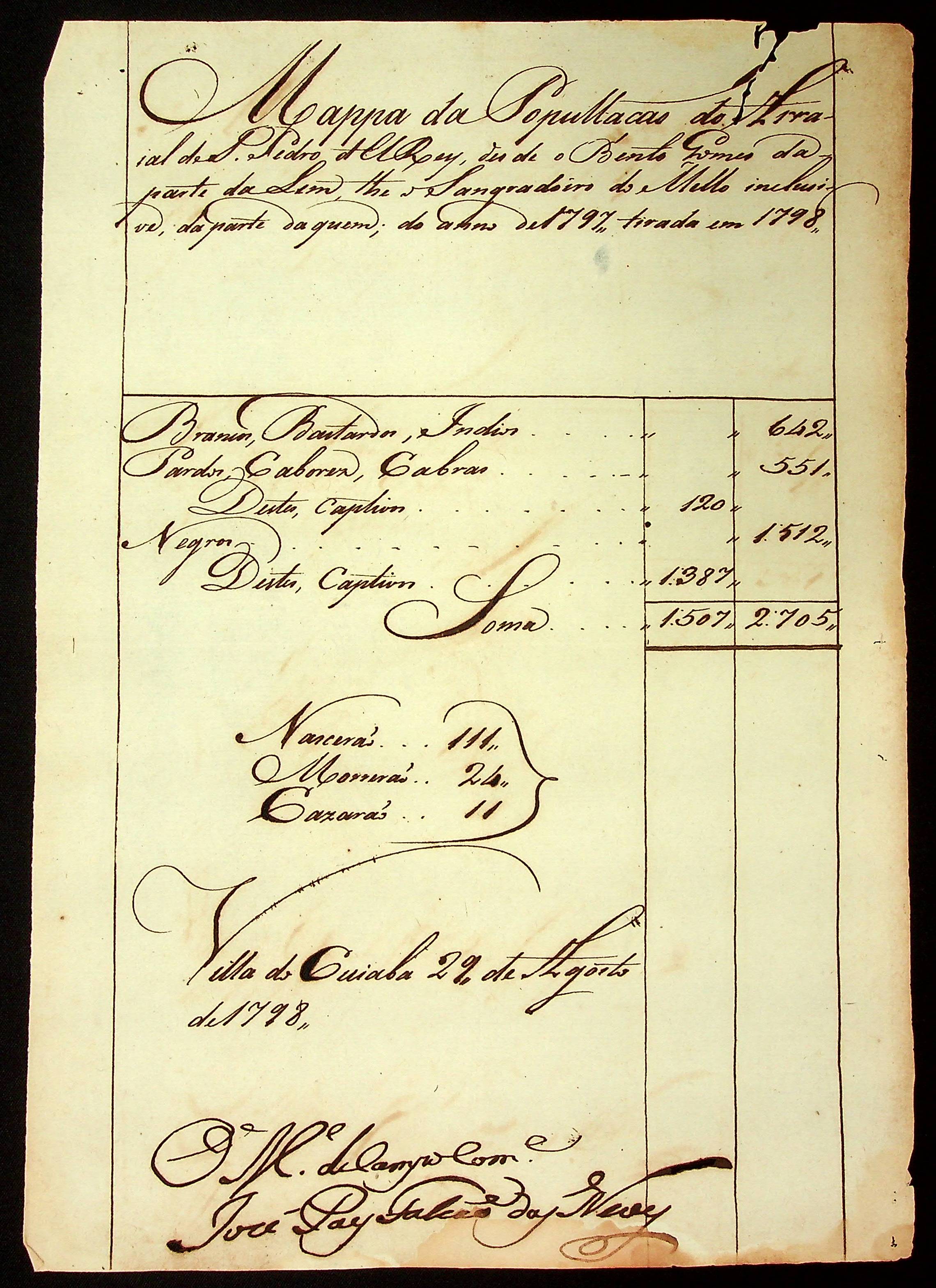 MAPA DE POPULAÇÃO da Vila do Cuiabá, da Missão de Santa Ana e do Arraial de São Pedro D'El Rei, passada pelo Mestre de Campo José Paes Falcão das Neves.