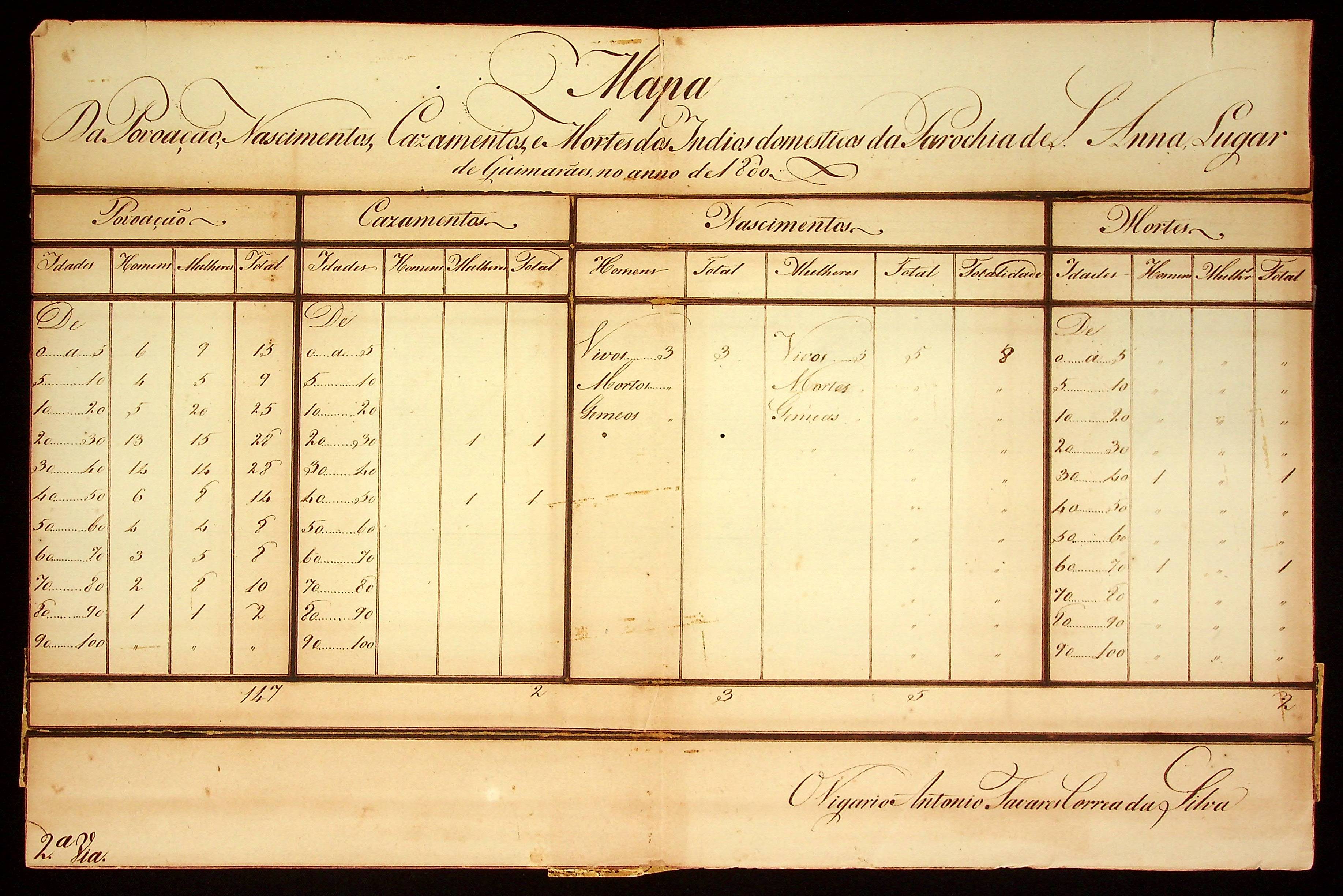 MAPA DE POPULAÇÃO, casamentos e mortes dos índios domésticos da Paróquia de Santa Ana Lugar de Guimarães.