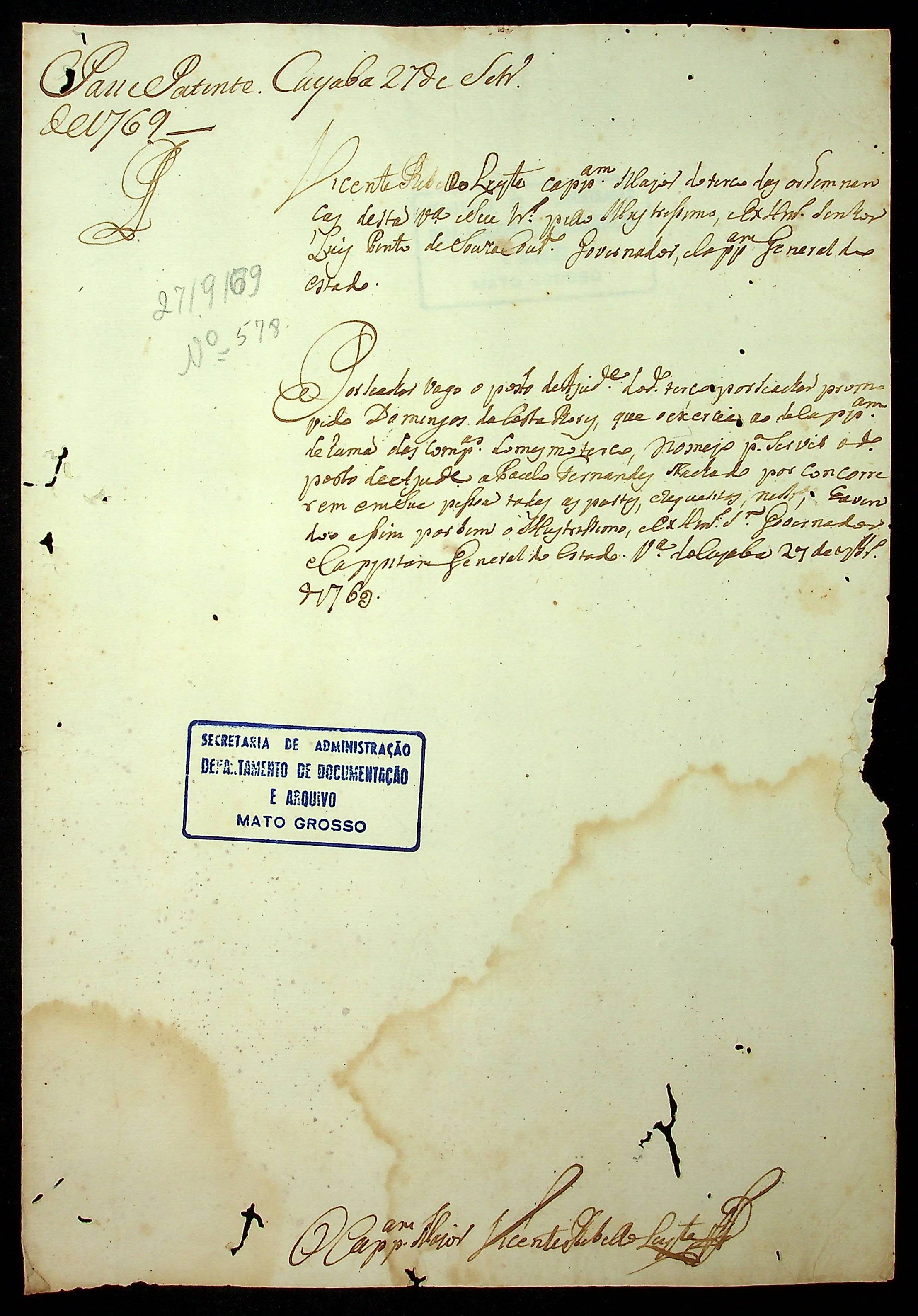 NOMEAÇÃO de Paulo Fernandes Machado ao posto de Ajudante do Terço de Ordenança da Vila do Cuiabá.