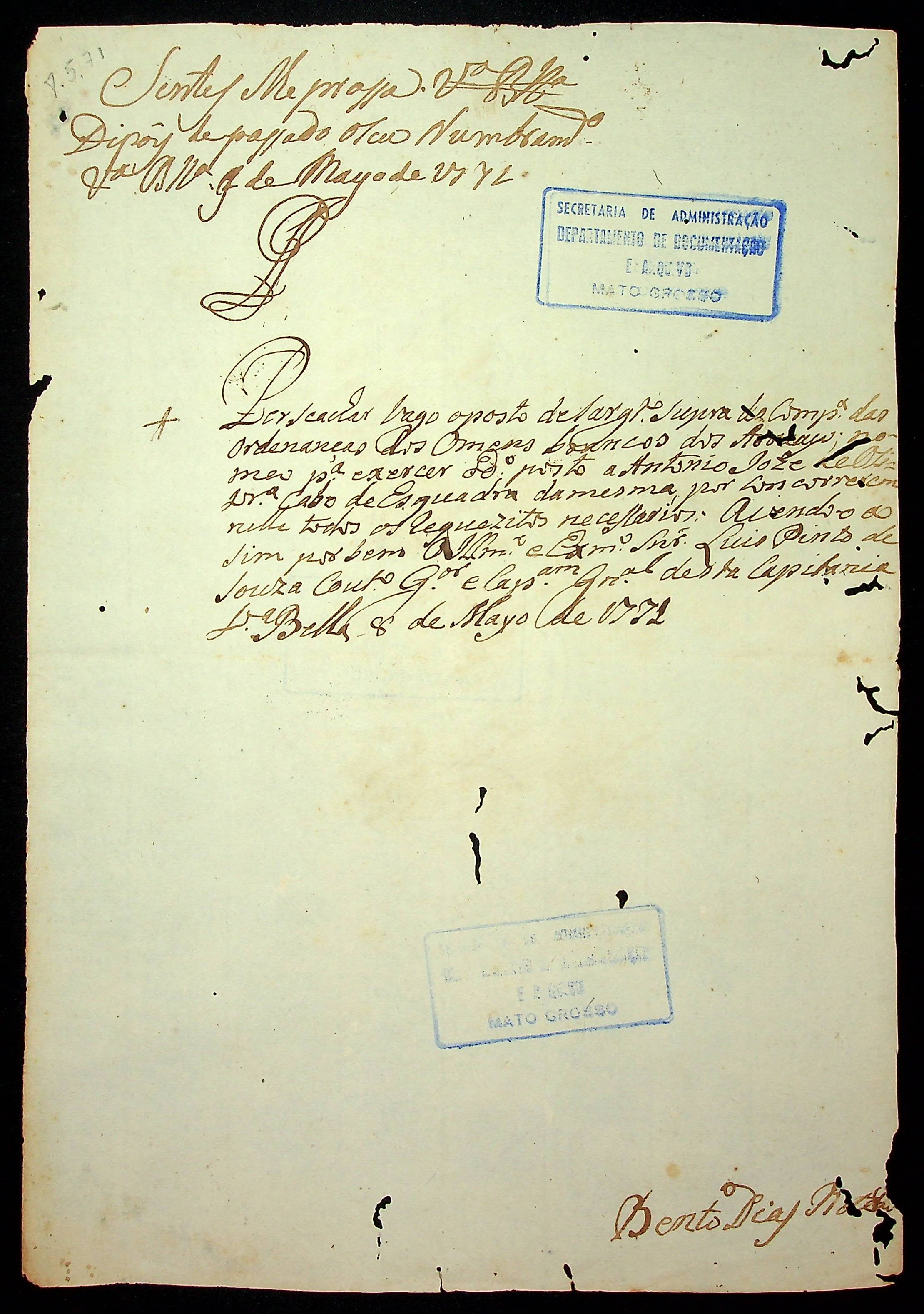NOMEAÇÃO de Antônio José de Oliveira ao posto de Sargento Supra da Companhia das Ordenanças dos Arraiais, passada pelo [Governador e Capitão General da Capitania de Mato Grosso] Luiz Pinto de Souza Coutinho.