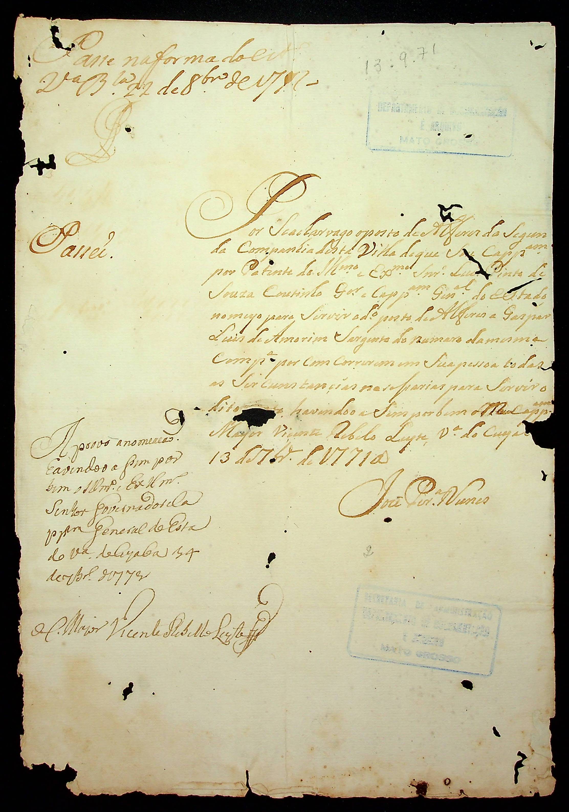 NOMEAÇÃO de Gaspar Luiz de Amorim ao posto de Alferes da segunda Companhia da Vila do Cuiabá, passada pelo Capitão José Pereira Nunes.