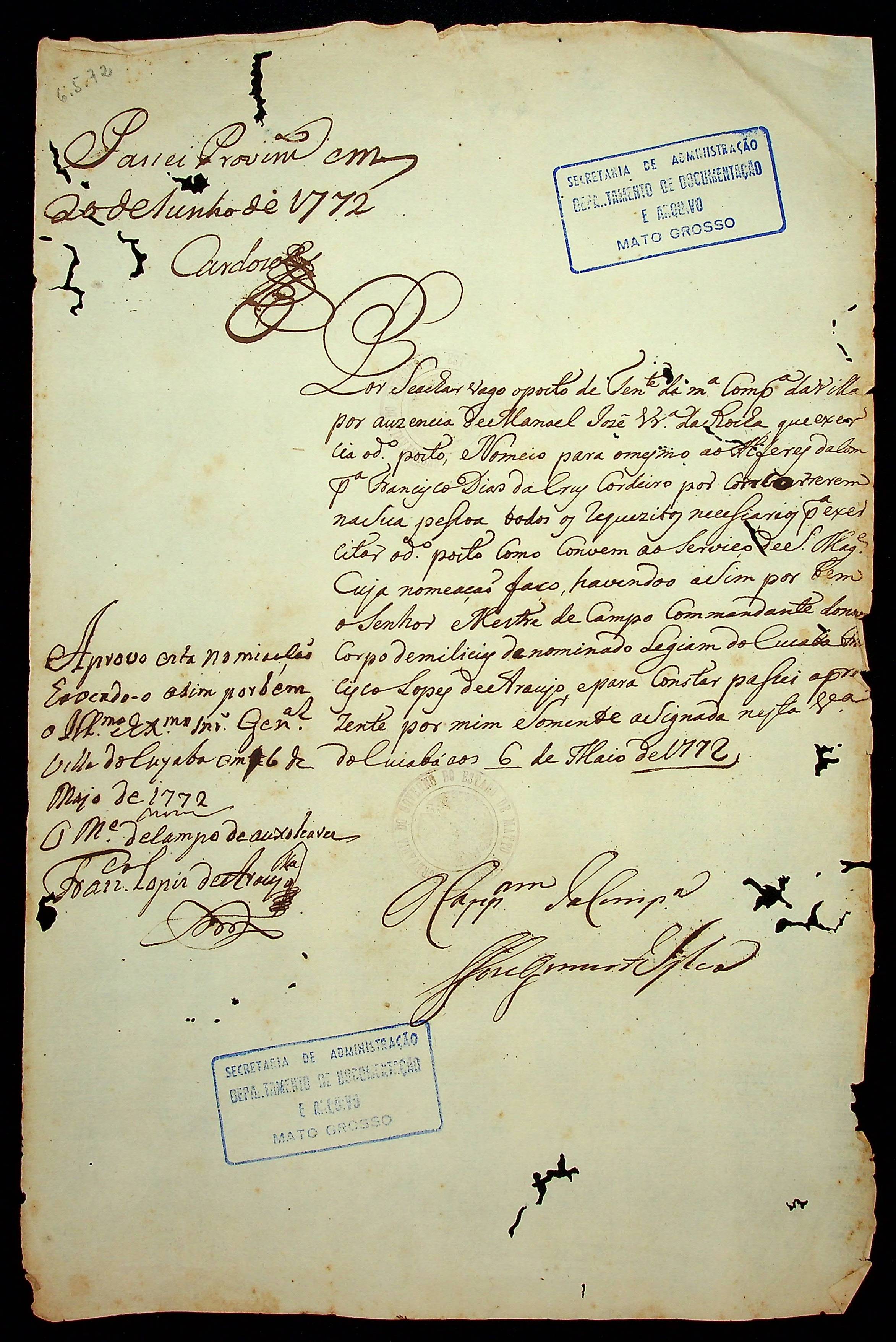 NOMEAÇÃO do Alferes da Companhia Francisco Dias da Cruz Cordeiro ao posto de Tenente, passada pelo capitão José Gomes [da Silva].