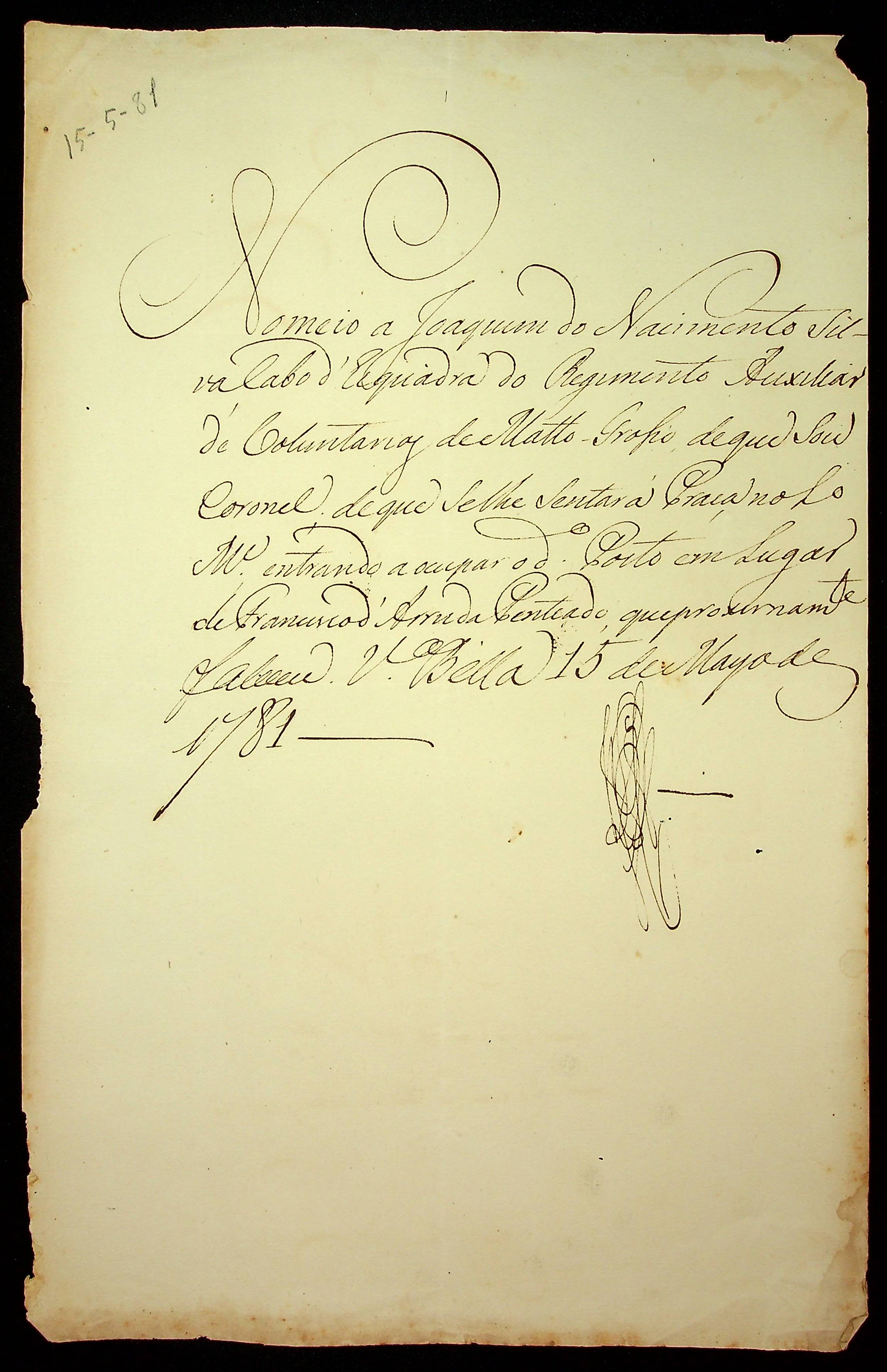 NOMEAÇÃO de Joaquim do Nascimento Silva para o cargo de Cabo de Esquadra do Regimento Auxiliar de Voluntários de Mato Grosso.