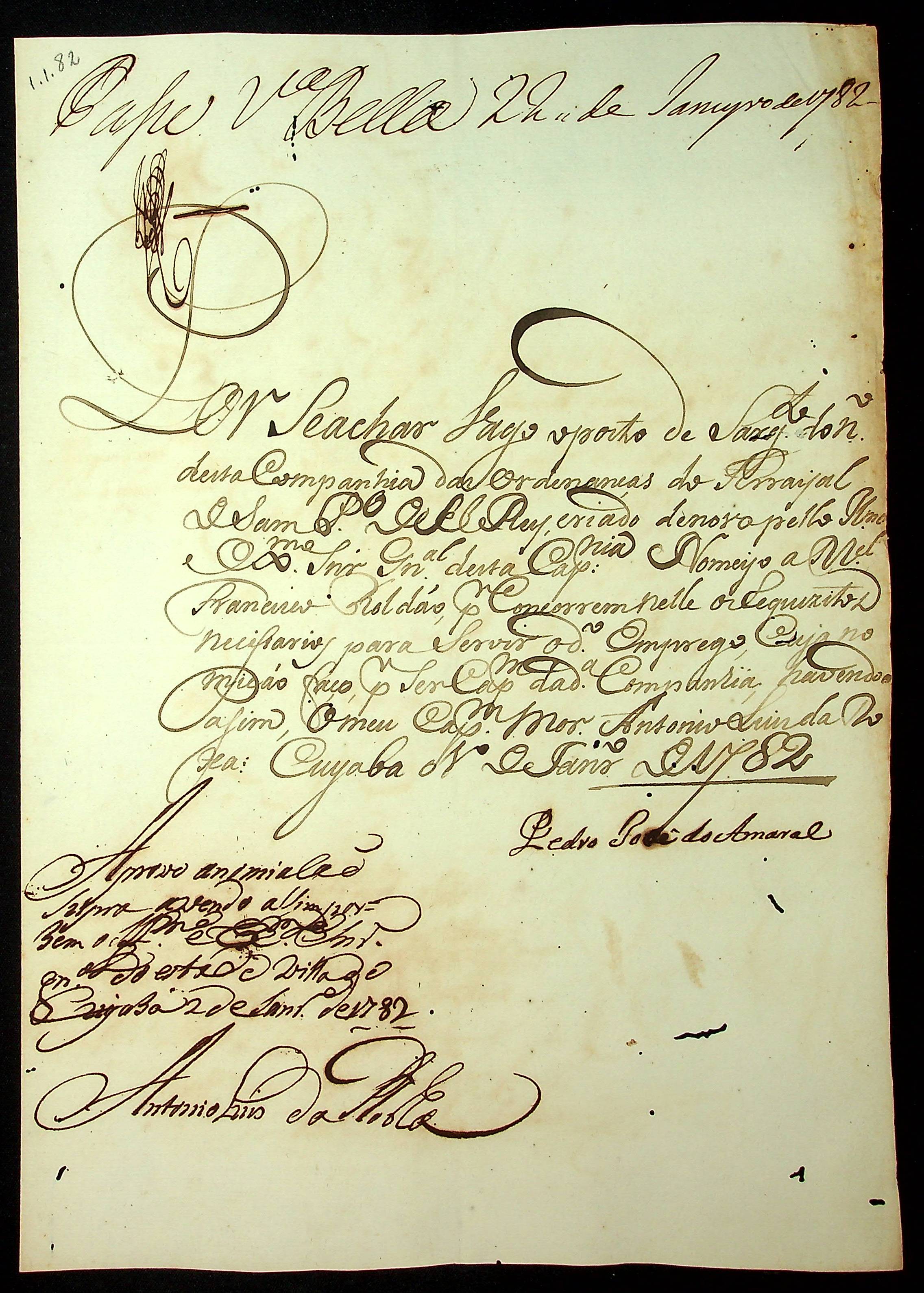NOMEAÇÃO de Manoel Francisco Roldão ao posto de Sargento do Número da Companhia de Ordenanças do Arraial de São Pedro D' El Rei, passado pelo Capitão Pedro José do Amaral.
